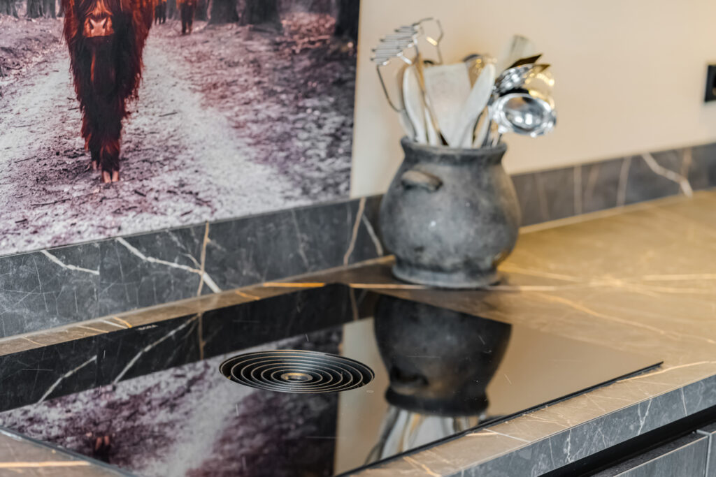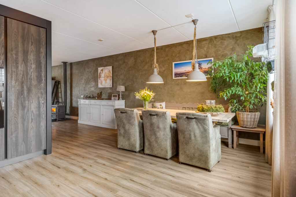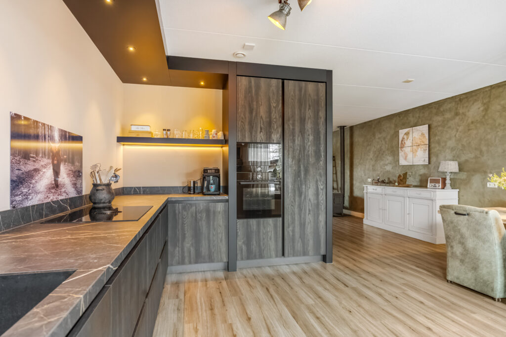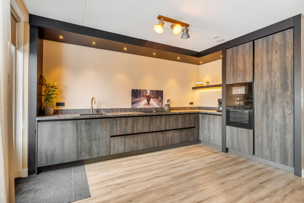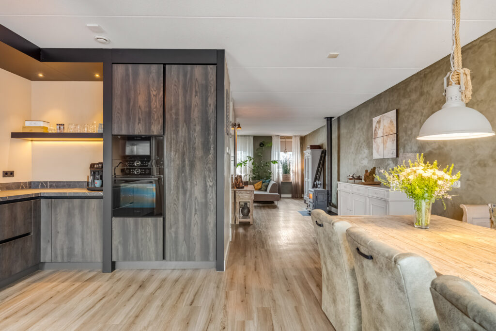 entree, hal met meterkast en toilet, ruime L vormige woonkamer met gezellige zithoek. Aan de achterzijde is de woning uitgebouwd en treft u de complete en bijna nieuwe woonkeuken ( 2023 ) welke is voorzien van een oven, magnetron, grote koelkast, vaatwasmachine, Bora inductie kookplaat met geïntegreerde afzuiginstallatie, cooker en bergruimte.
