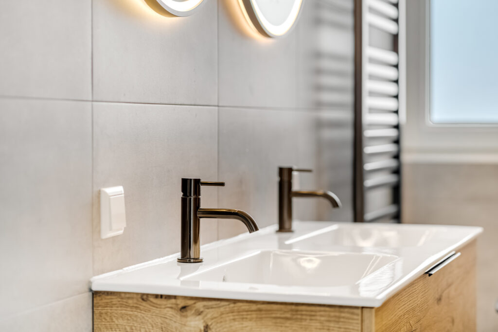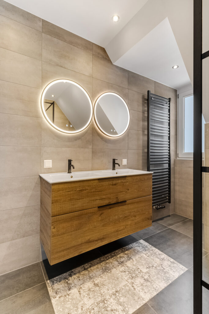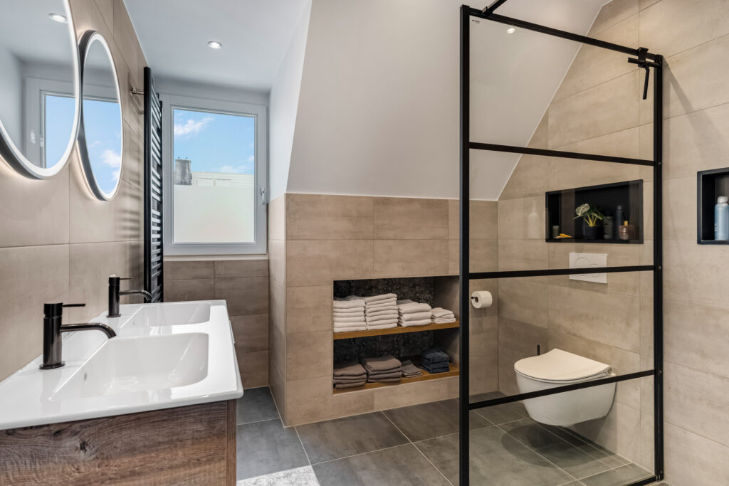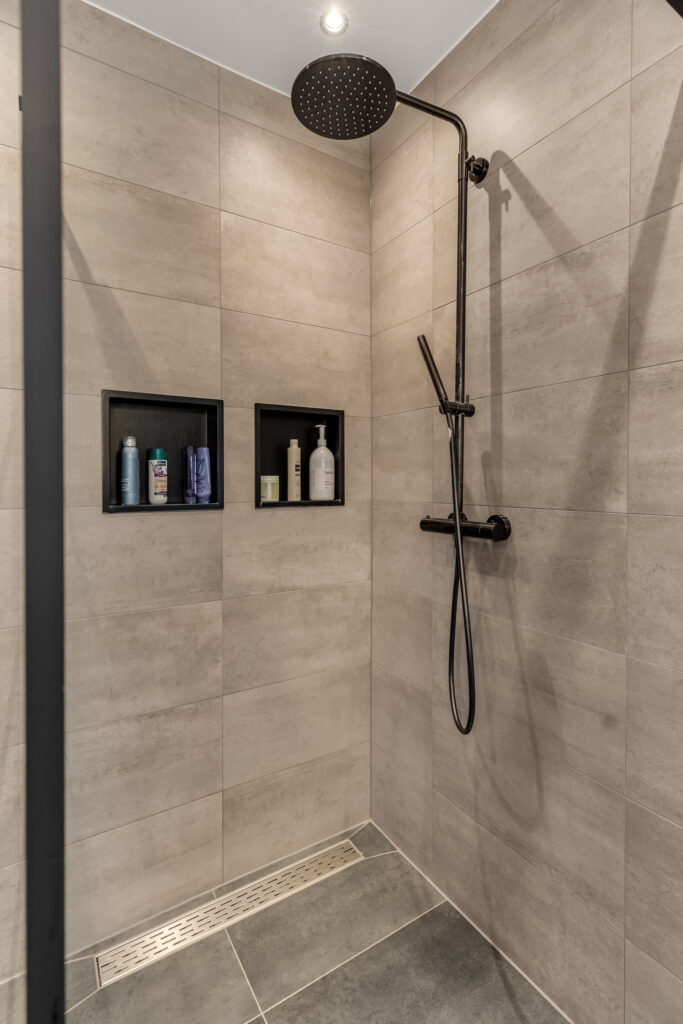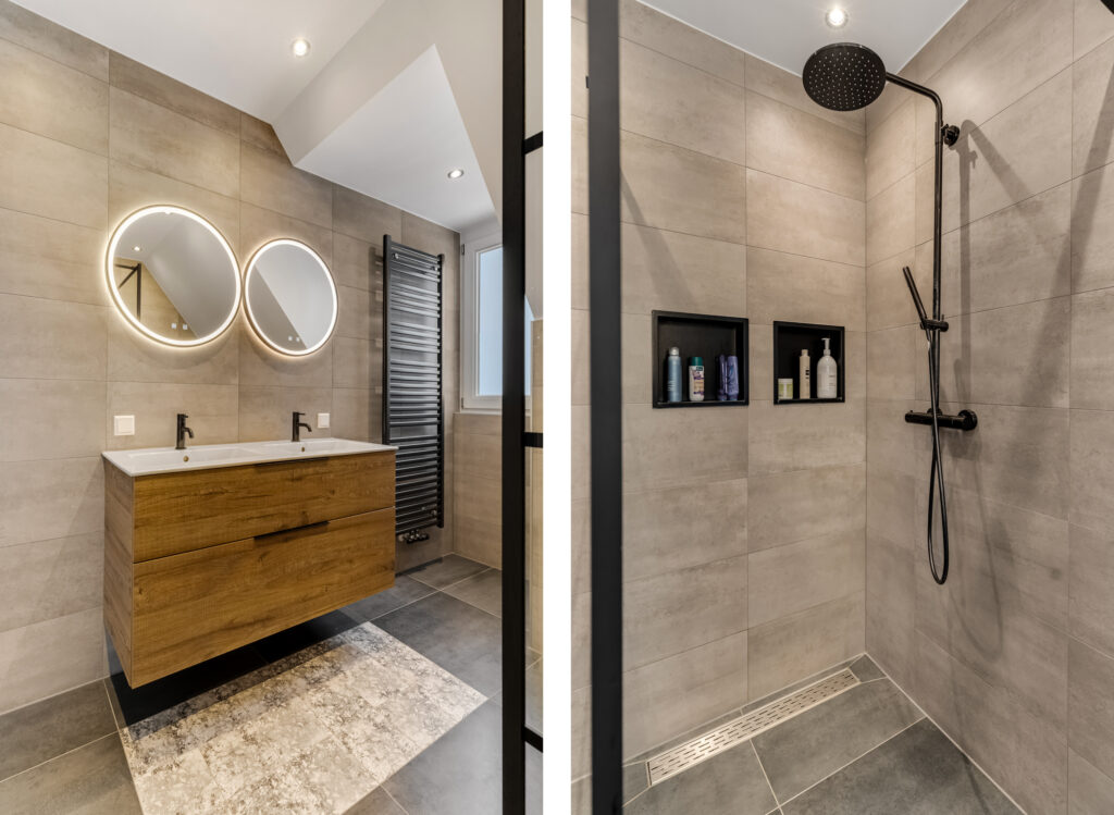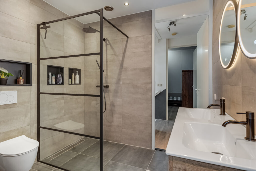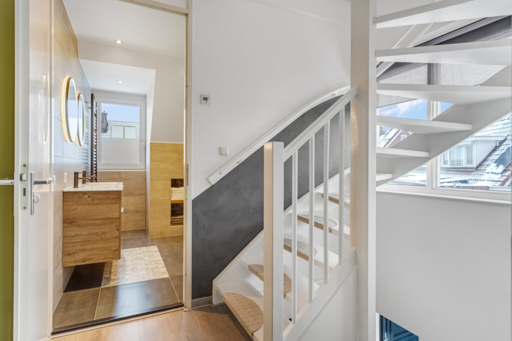 overloop met toegang tot 3 slaapkamers en badkamer ( 2023 ) voorzien van vloerverwarming, ruime inloopdouche, 2e toilet en dubbele vaste wastafel met meubel.