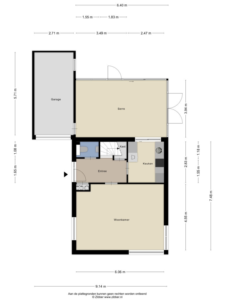 Je komt binnen in de hal met een toilet en fonteintje, meterkast (7 groepen, 2 aardlekschakelaars) en toegang tot de woonkamer. De lichte woonkamer heeft houten kozijnen met dubbel glas en een betonnen vloer, een goede basis om verder naar eigen smaak af te werken.