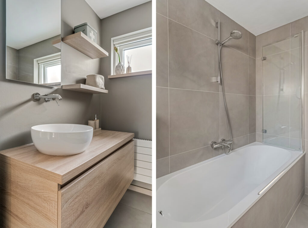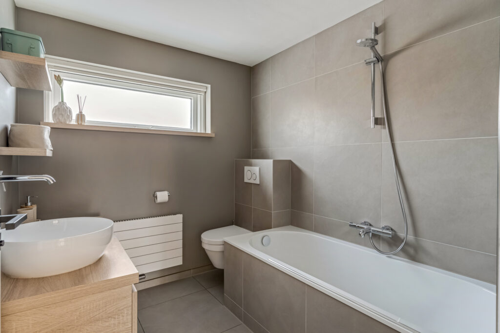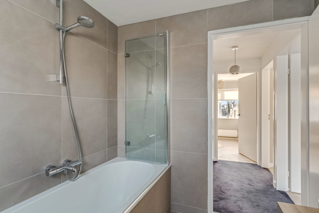 overloop met toegang tot 3 recht opgetrokken slaapkamers en luxe badkamer voorzien van luxe douche / ligbad combinatie, luxe meubel met greeploze onderkasten en 2e toilet.