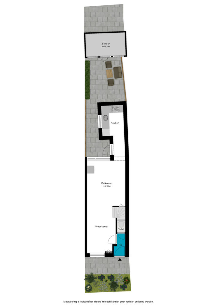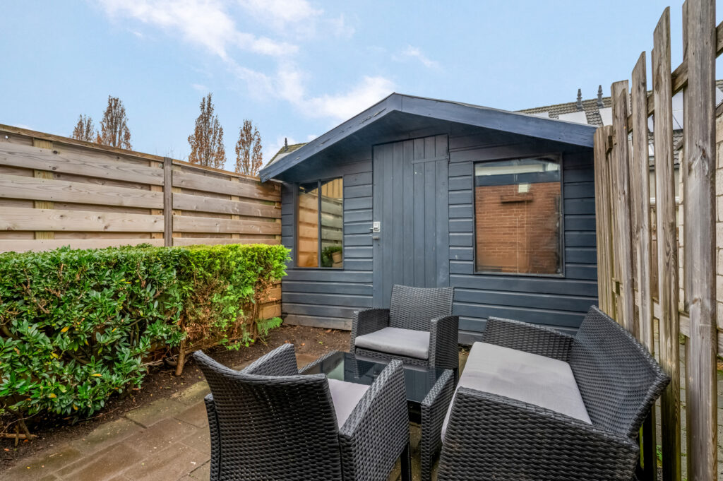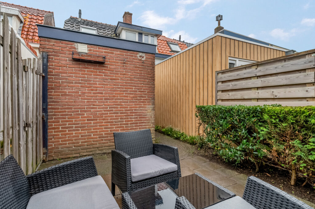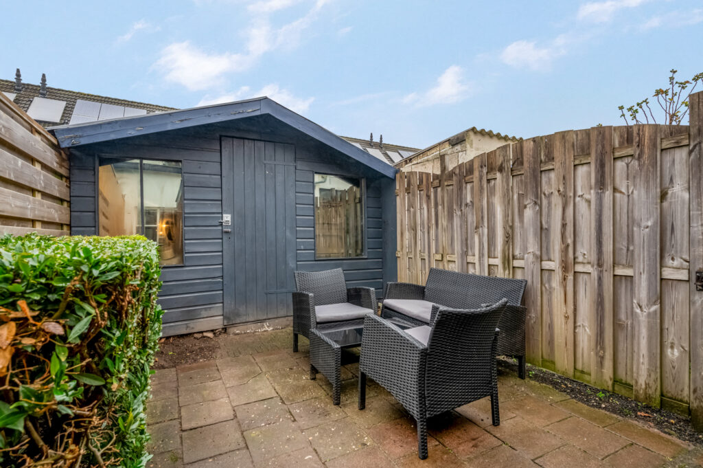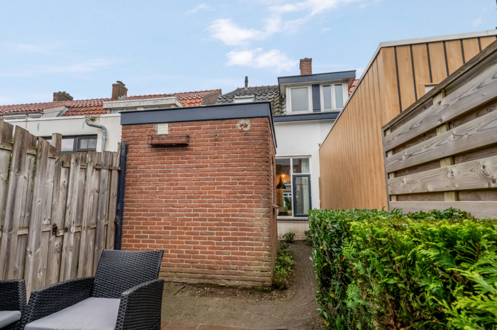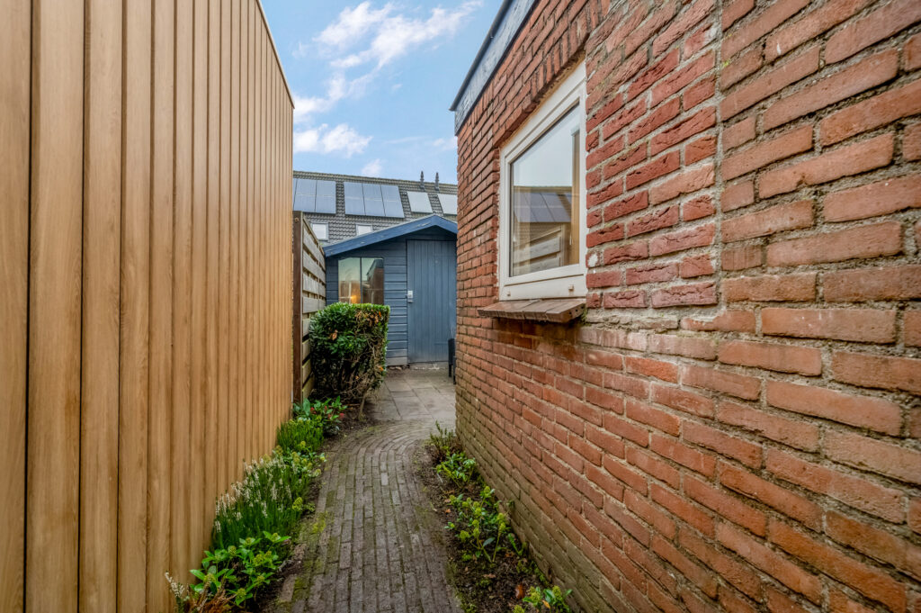 De tuin is gericht op het Westen; dus het middag- en avondzonnetje schijnt je tegemoet. Er is een praktische berging aanwezig en de tuin is ook bereikbaar via een achterom.