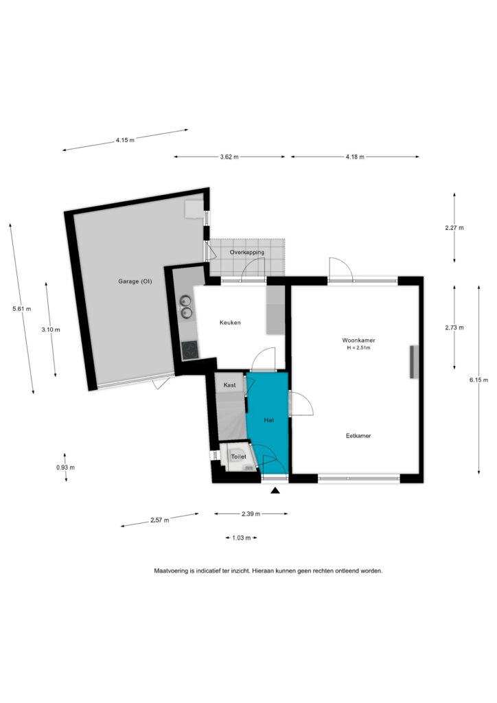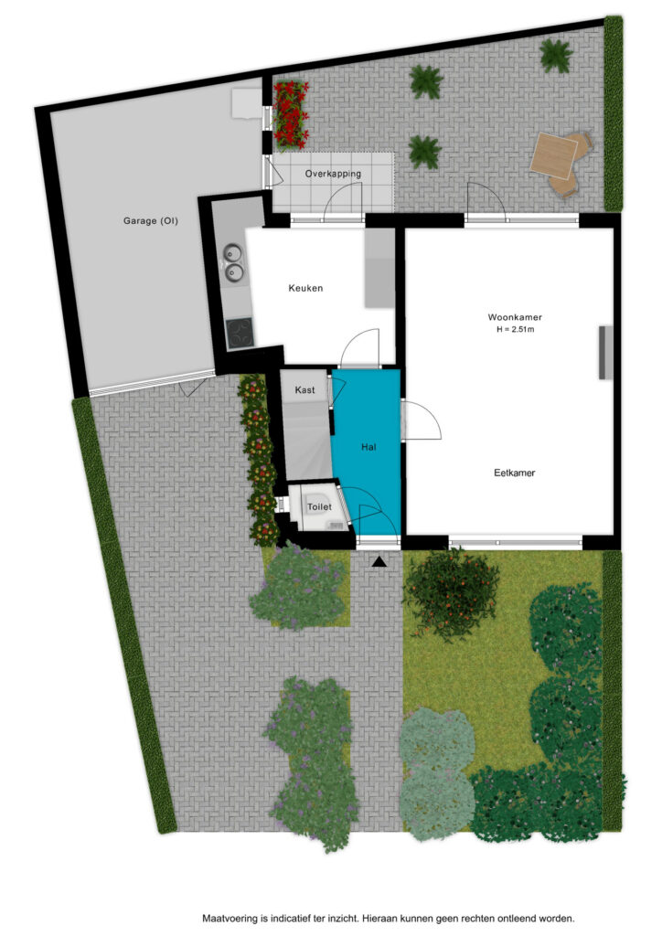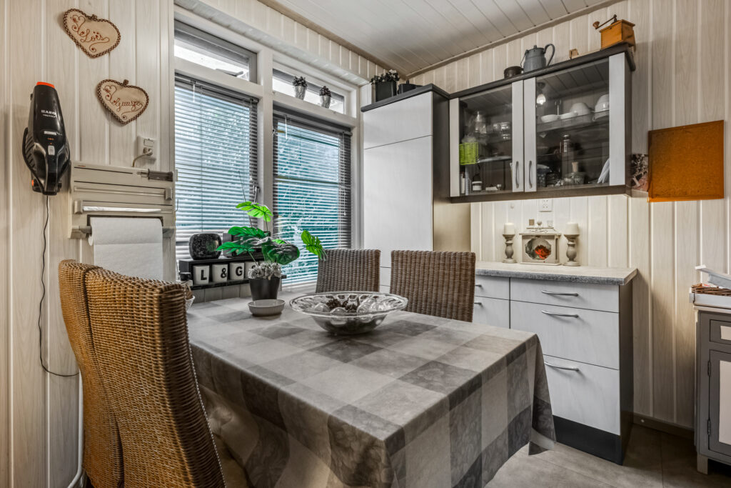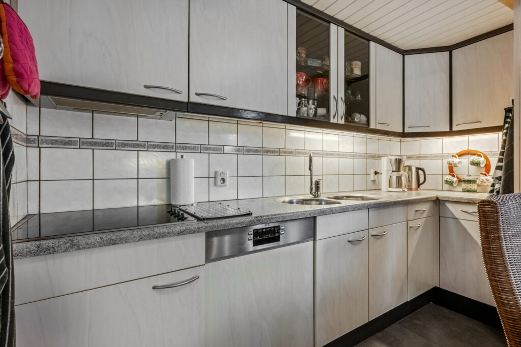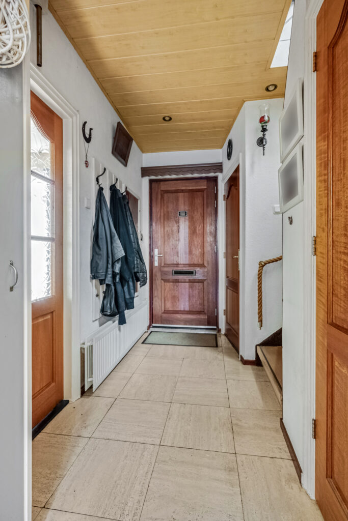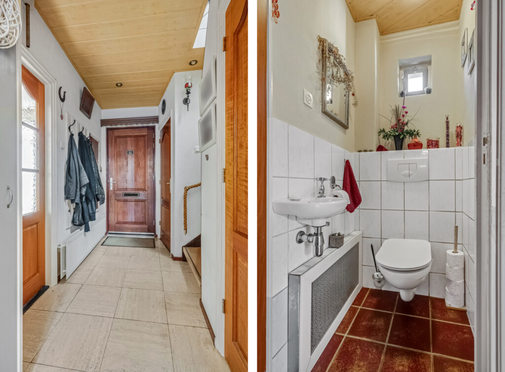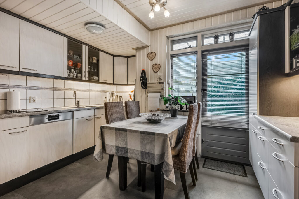 entree, hal, meterkast en toilet. Doordat de keuken een stukje is ‘ingebouwd ‘in de garage beschik je over een gezellige woonkeuken. De keuken zelf is voorzien van een koel- vriescombinatie, een keramische kookplaat met afzuigschouw, een dubbele spoelbak en veel bergruimte.