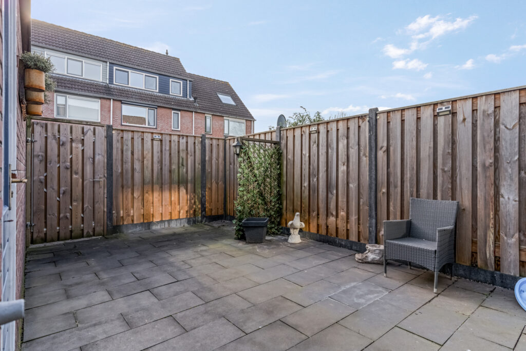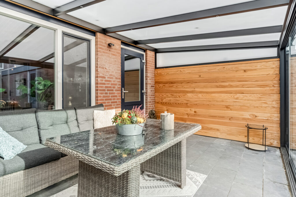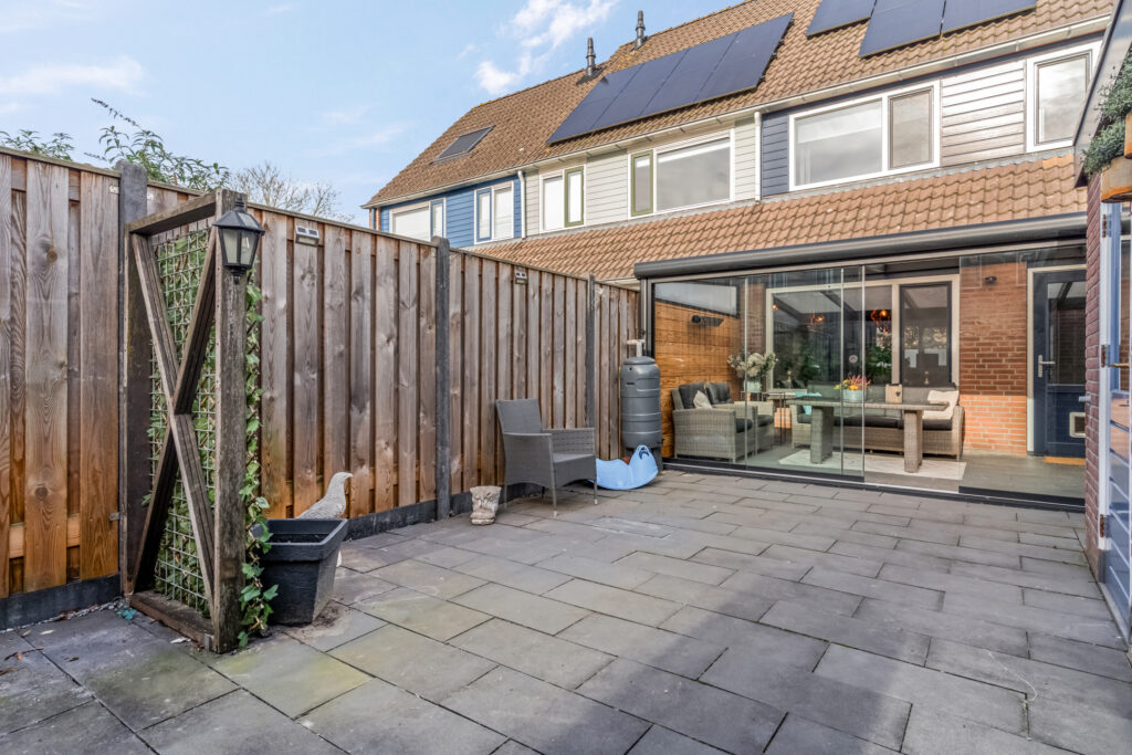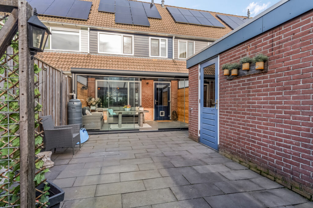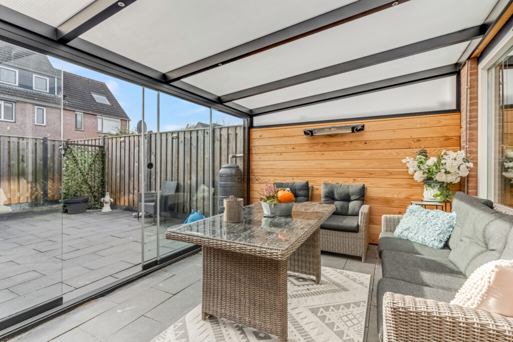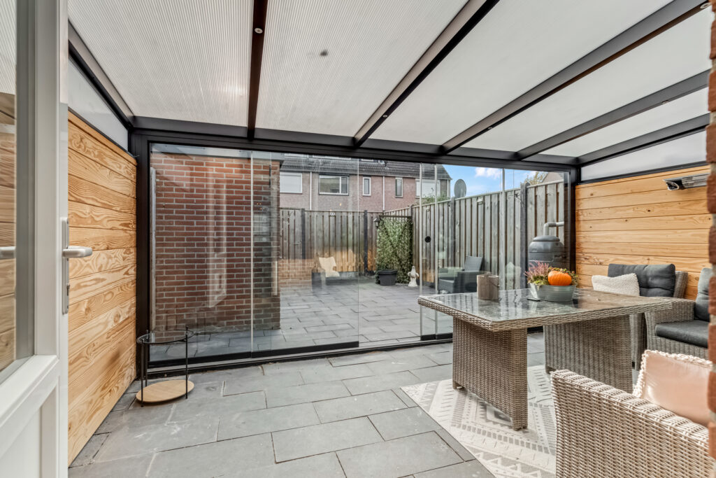 Achter de woning ligt een fijne tuin met een veranda gegrensd aan het huis, voorzien van glazen wanden en verlichting. Een heerlijke plek om het hele jaar door van te genieten. Daarnaast zijn er een stenen berging en een achterom aanwezig. Aan de voorzijde van de woning ligt ook nog een mooi stuk tuin wat helemaal bestraat is.