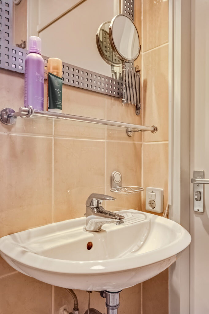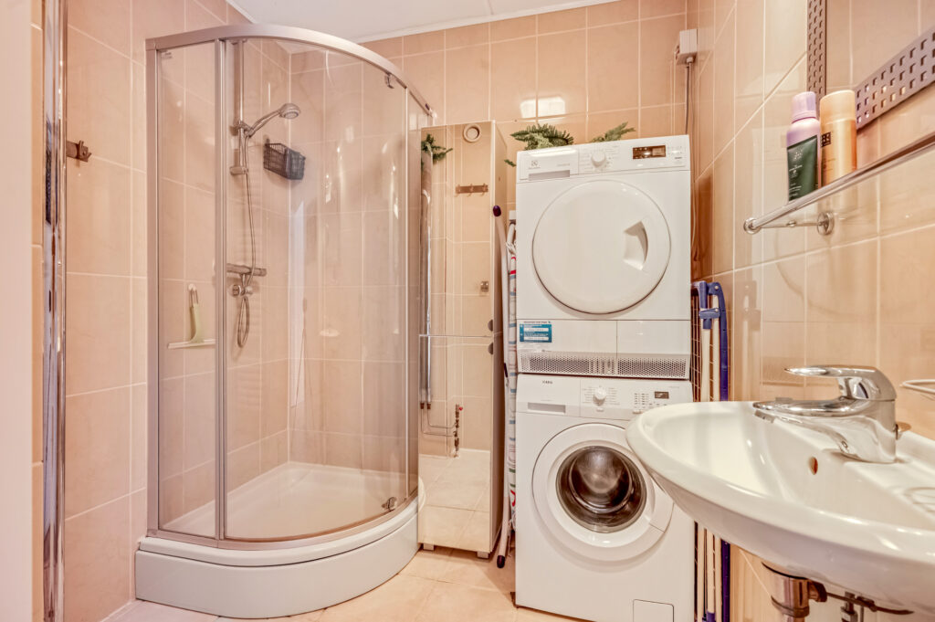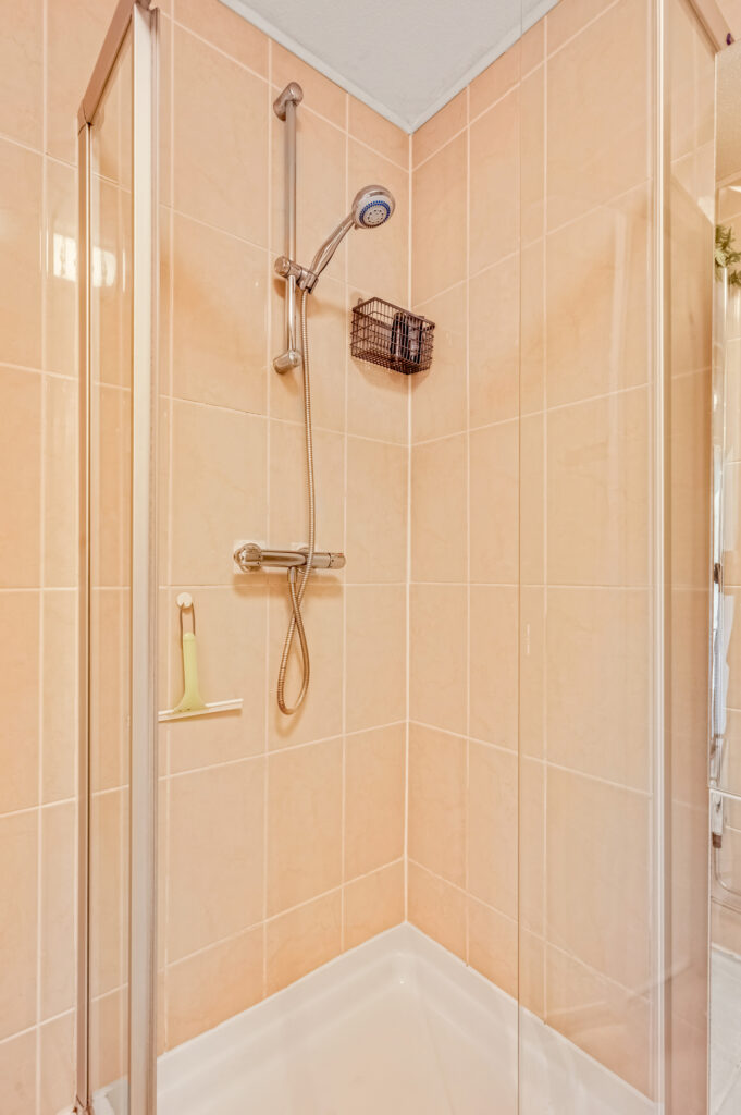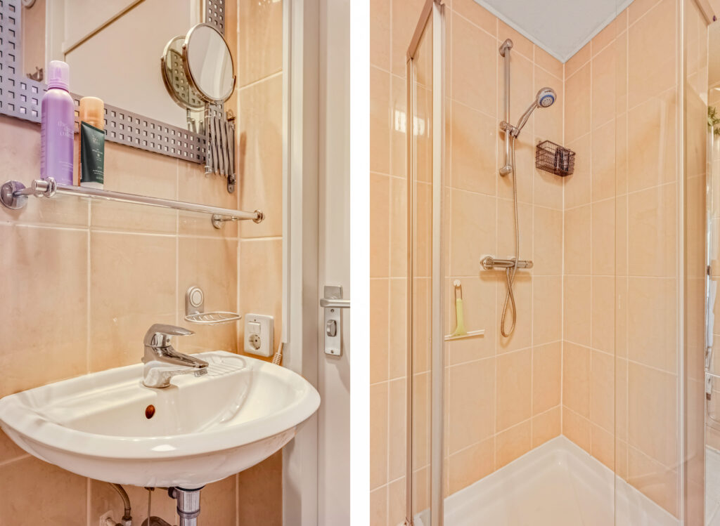 De badkamer is voorzien van een douche cabine, vaste wastafel en de witgoed aansluitingen.
