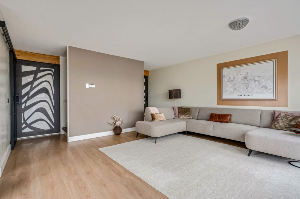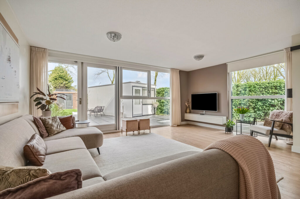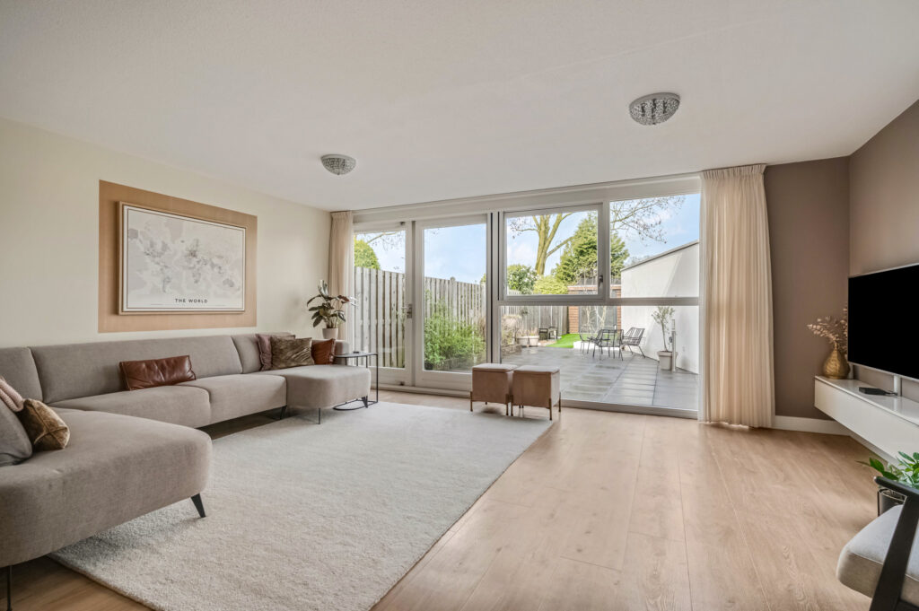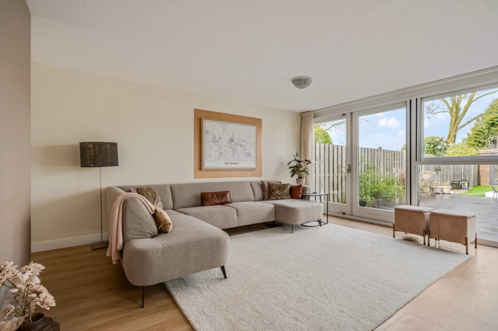 De woonkamer is tuingericht, heeft openslaande deuren en gestuucte wanden.