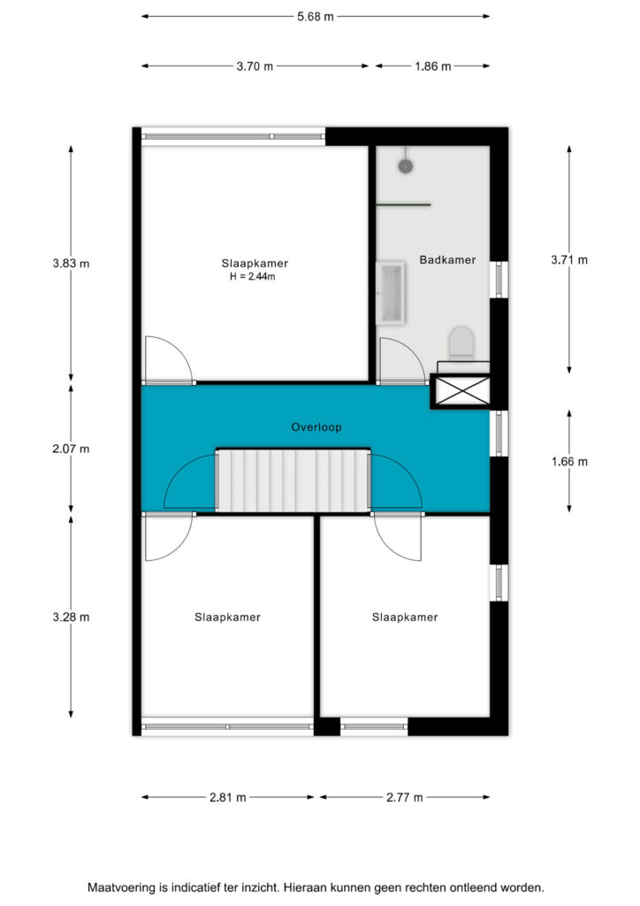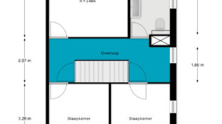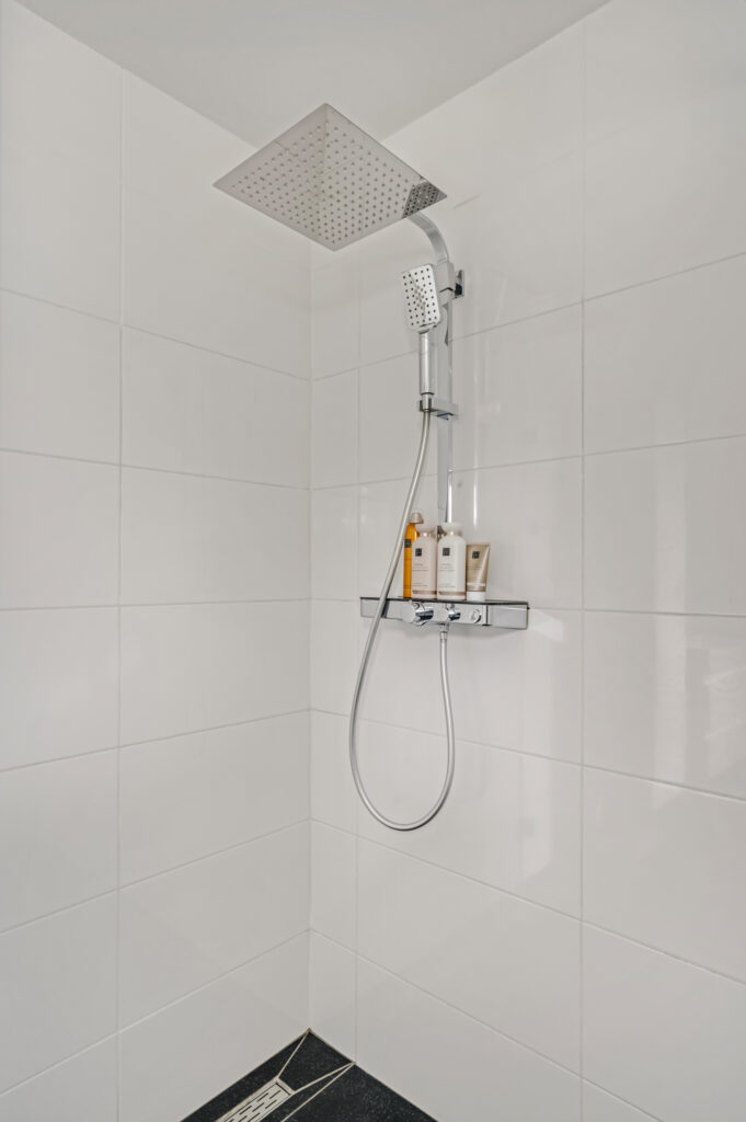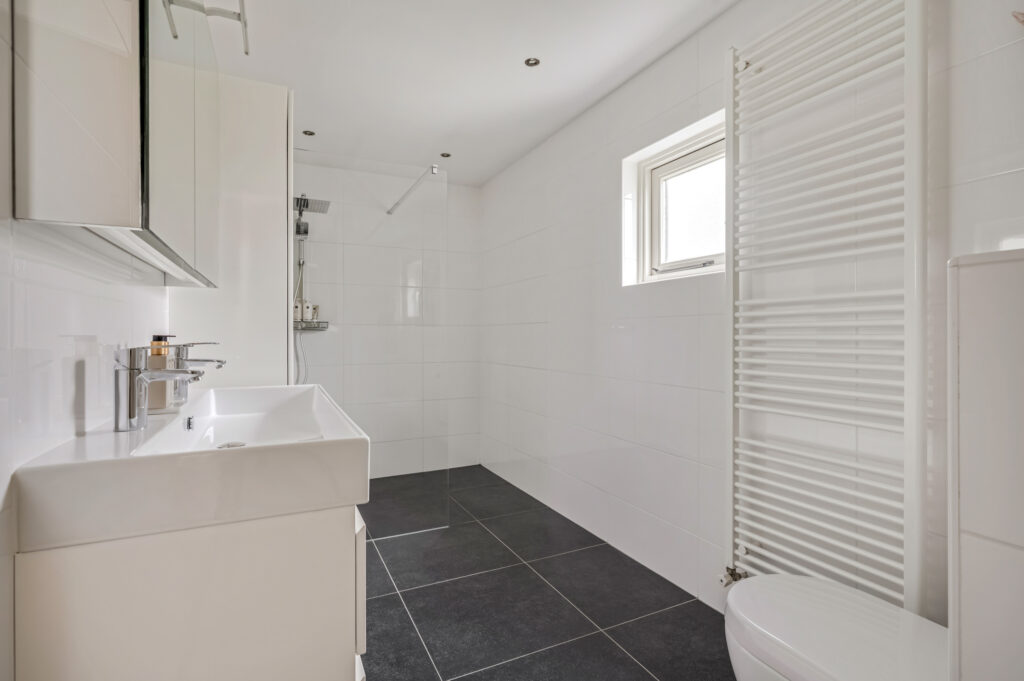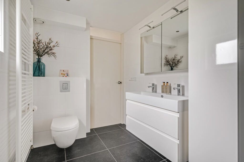 overloop met toegang tot een drietal recht opgetrokken slaapkamers. De badkamer is modern en voorzien van een inloopdouche, 2e toilet en vaste wastafel met dubbele kraan.