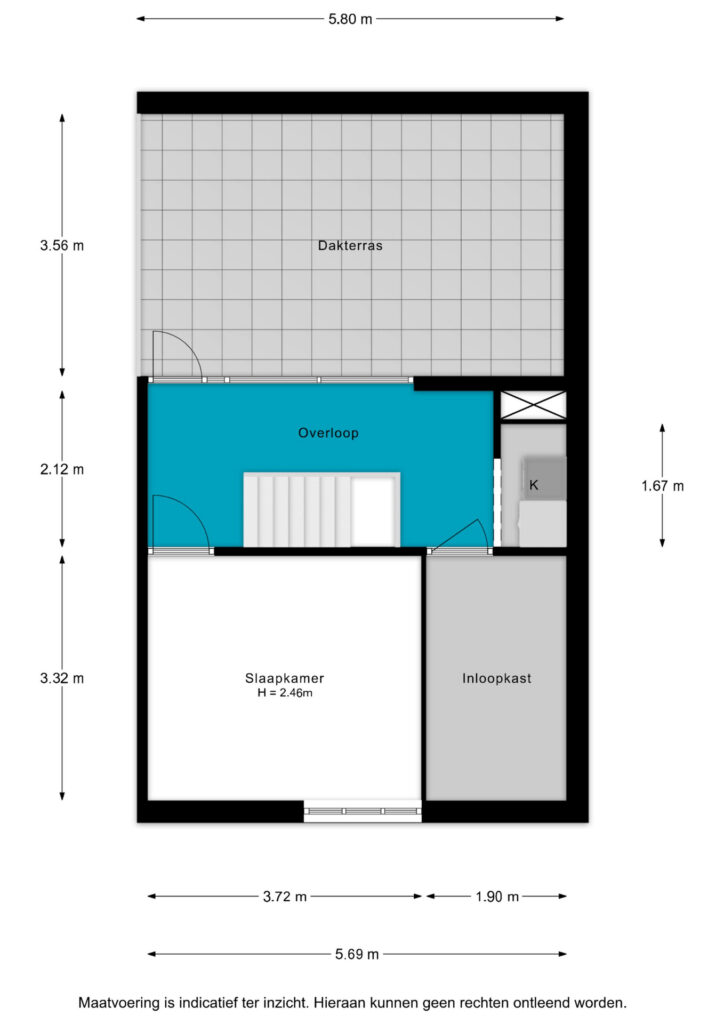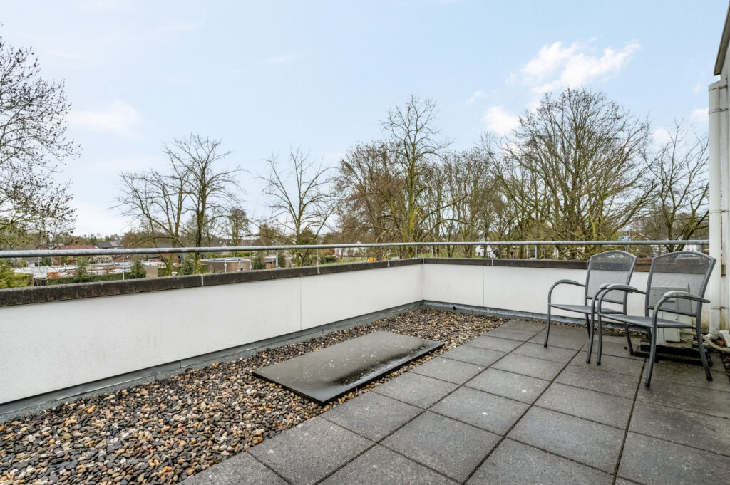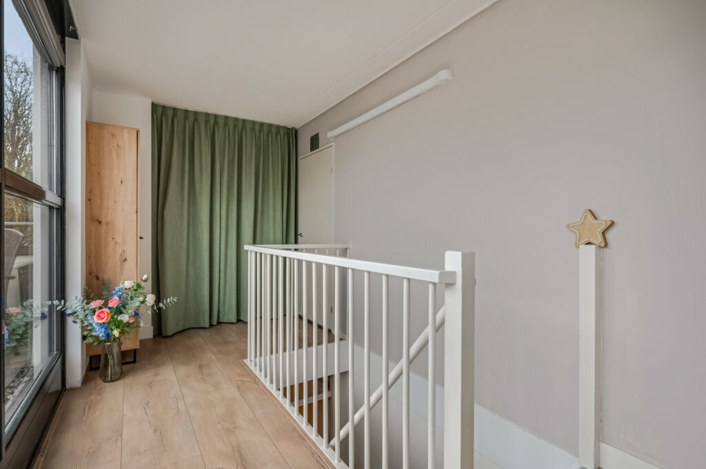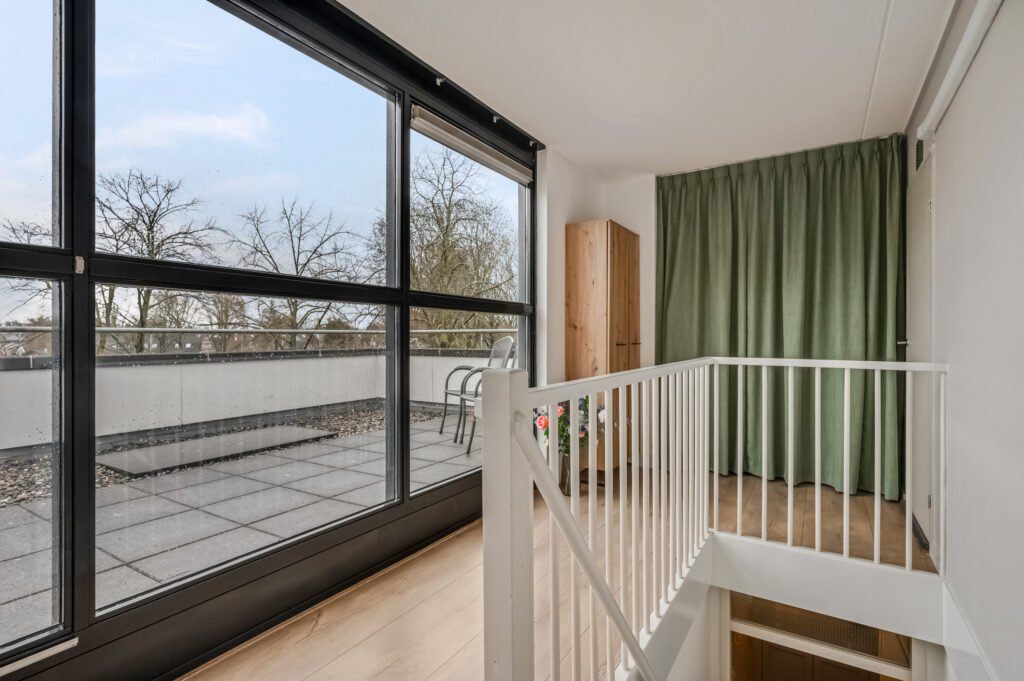 De verdieping heeft een laminaatvloer (brede plank) en toegang tot een dakterras.
