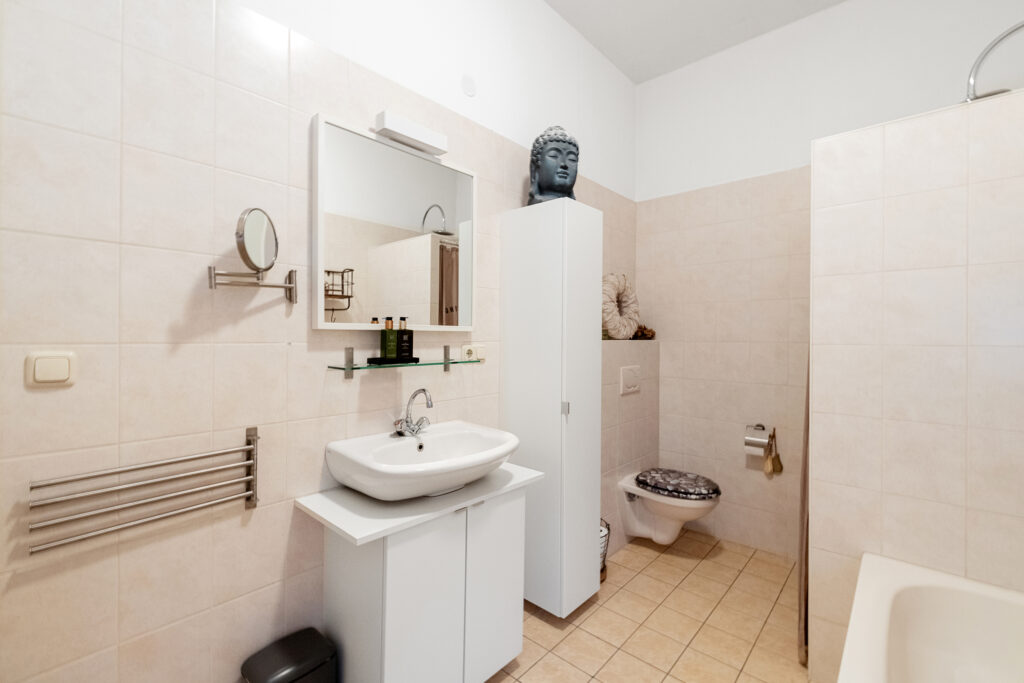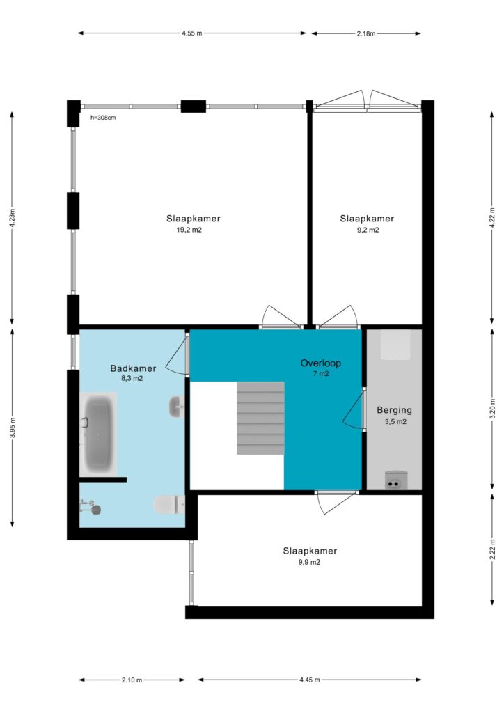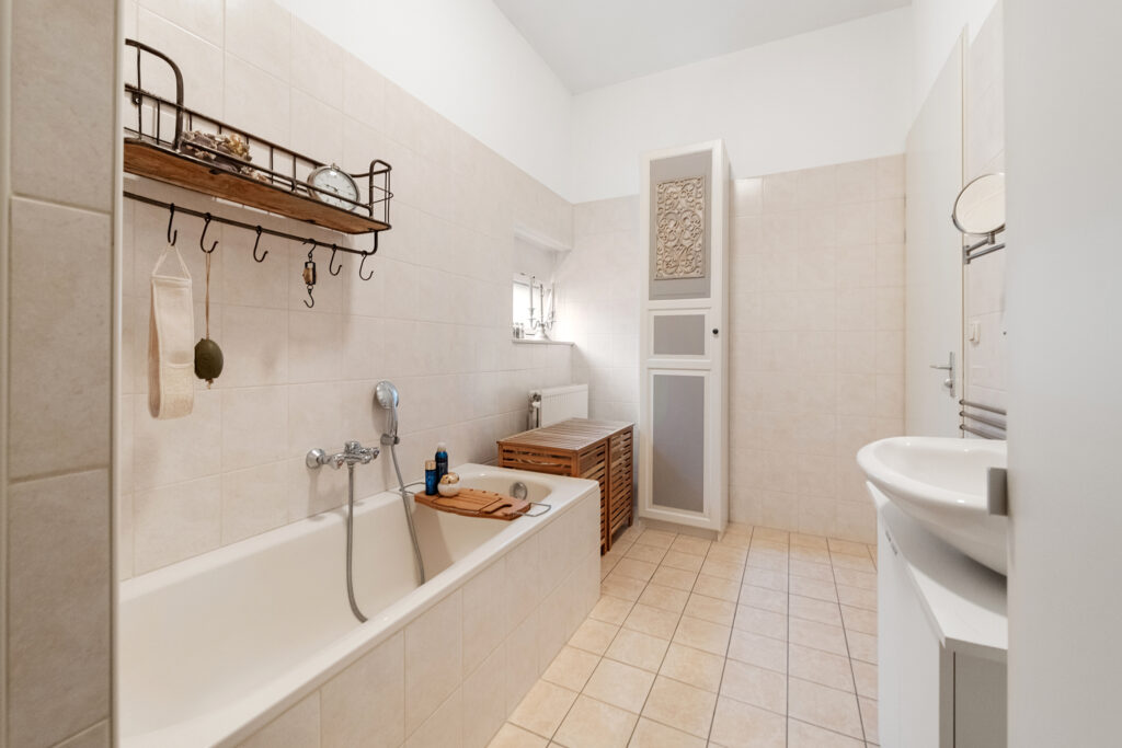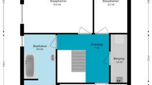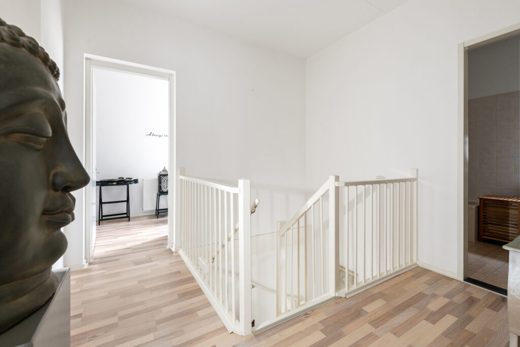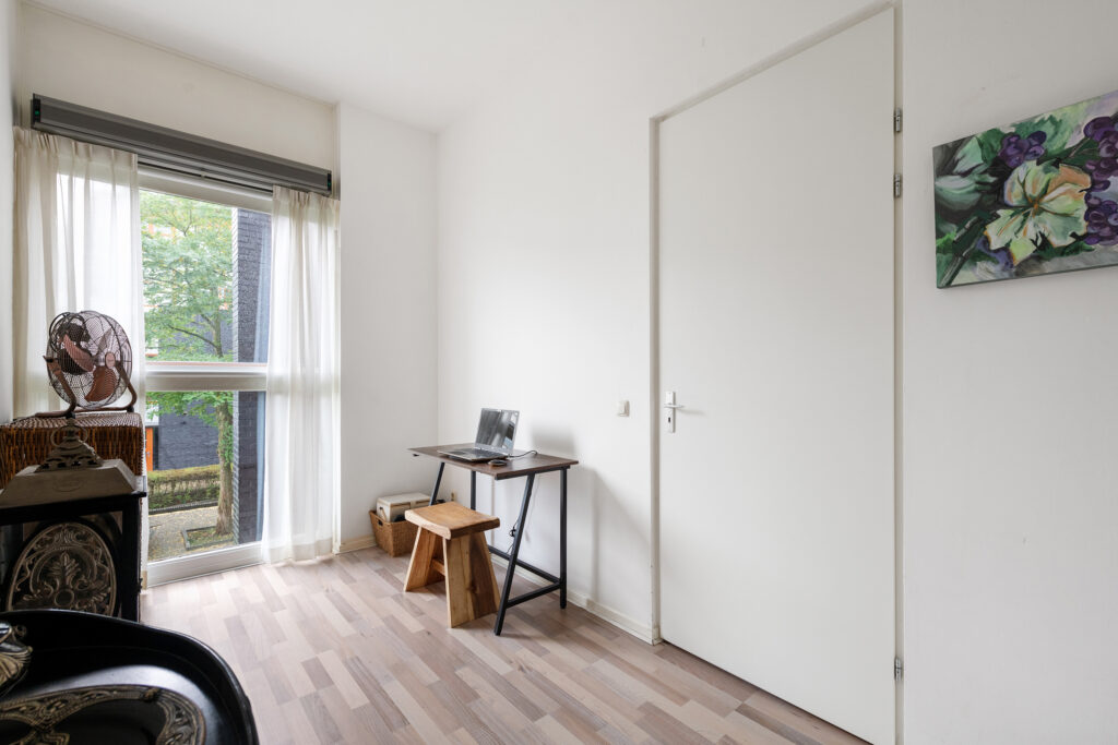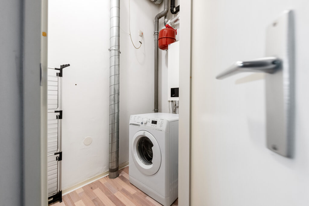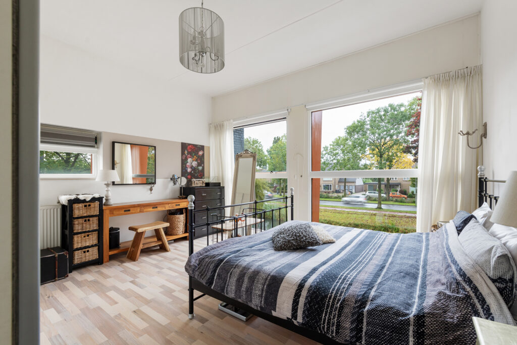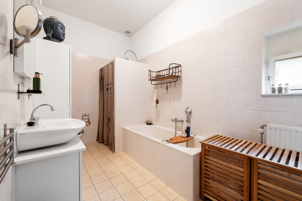 Vanaf de overloop bereik je drie goed bemeten slaapkamers, allemaal met een prettige lichtinval. De badkamer is compleet uitgerust met een ligbad, aparte douche, tweede toilet en wastafelmeubel. Op de overloop vind je daarnaast een aparte wasruimte met aansluitingen voor wasmachine en droger, én de CV- installatie (eigendom, 2023).