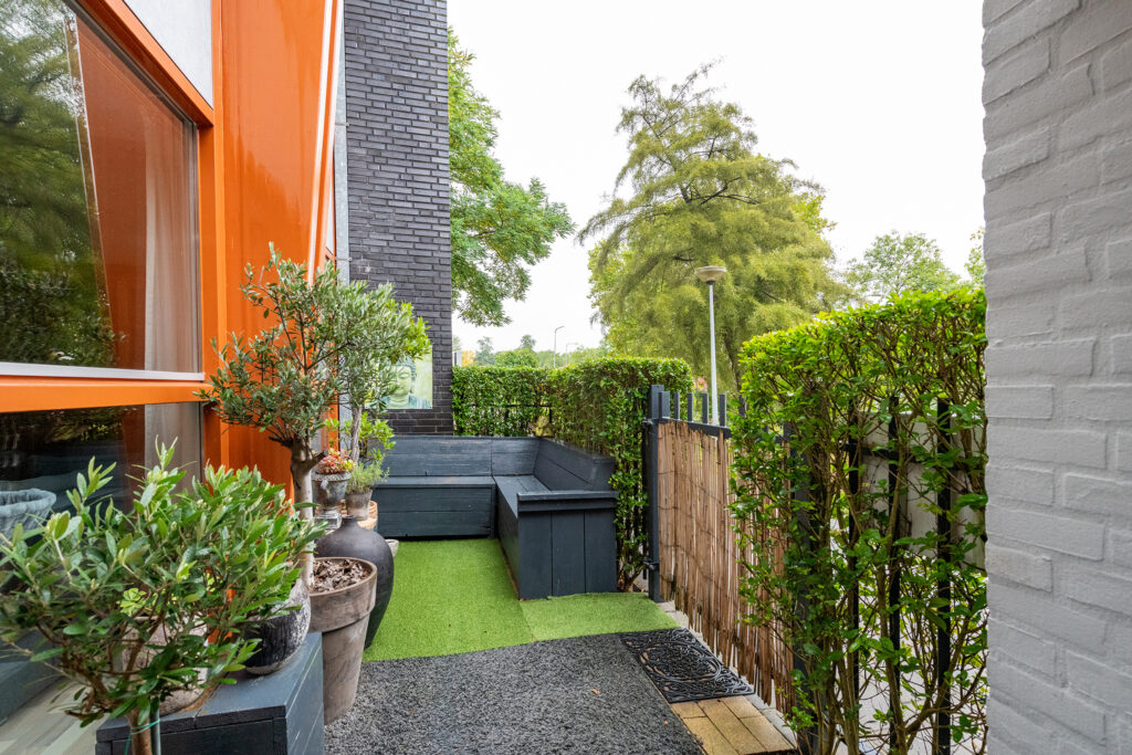 Aan de voorzijde ligt een zonnig terras op het zuiden waar je het hele jaar door kunt genieten van de zon — ideaal voor een kop koffie in de ochtend of een borrel aan het einde van de dag.