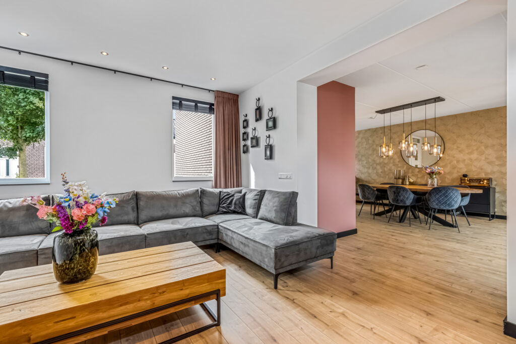 De woonkamer is heerlijk in de uitbouw en voorzien van een airco, vloerverwarming, spotjes en voldoende lichtinval.