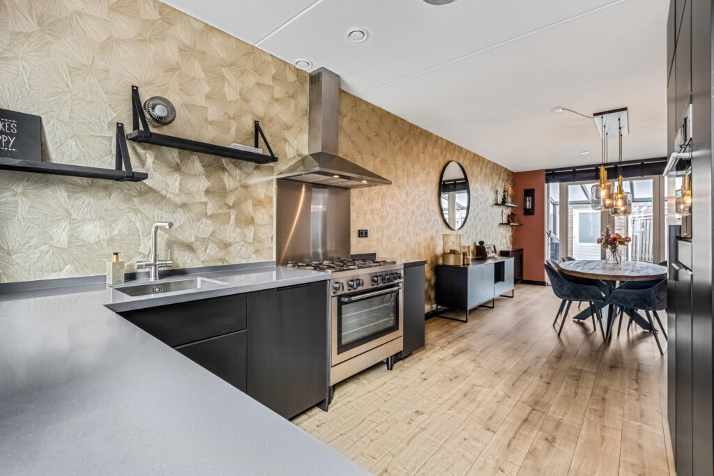 entree, hal, meterkast, toilet, woonkeuken. De keuken bevindt zich aan de voorzijde en is voorzien van een 5-pits gaskookplaat, afzuigkap, oven, vaatwasser, koelkast, vriezer, combi- magnetron, kokend – en gefilterd waterkraan en voldoende bergruimte.