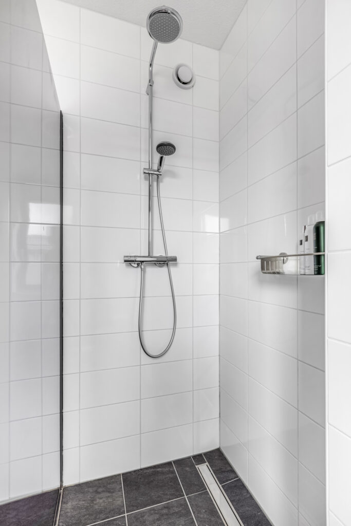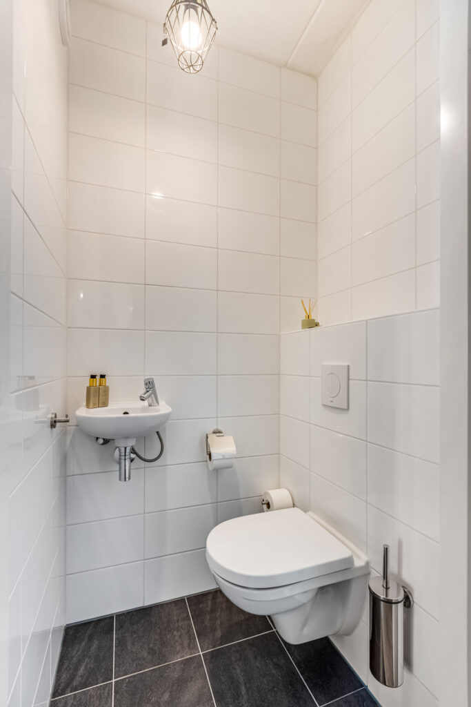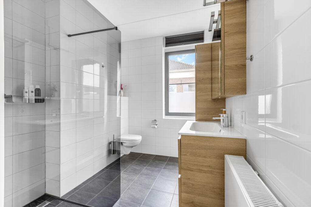 overloop met toegang tot een drietal slaapkamers, waarvan zich 1 voor en 2 aan de achterzijde bevinden. De badkamer is voorzien van een inloopdouche met stort- en handdouche, vaste wastafel en 2e toilet.