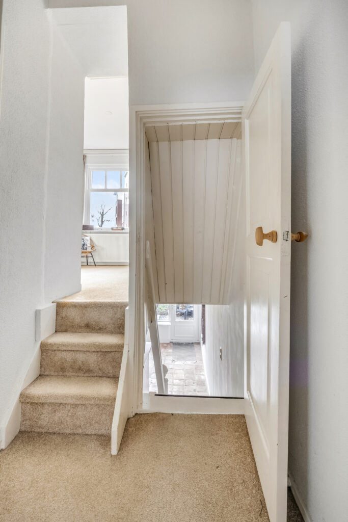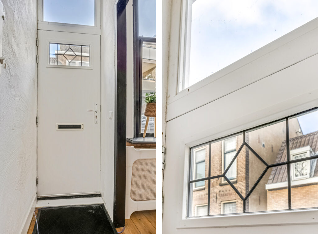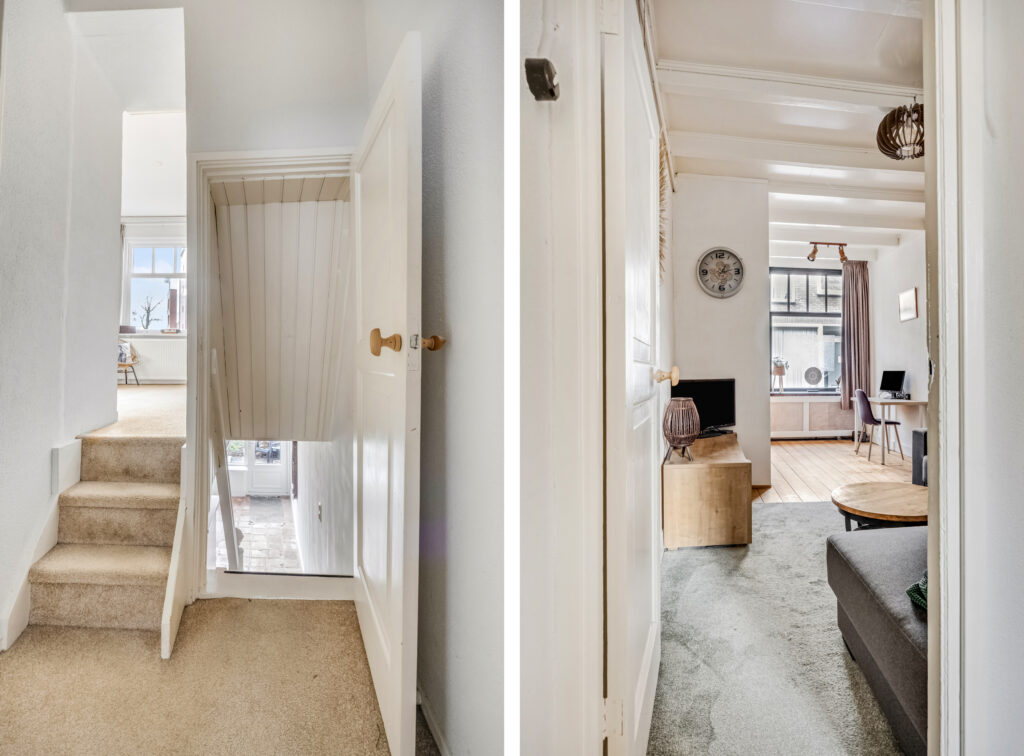 begane grond: hal met meterkast, sfeervolle straatgerichte woonkamer, portaal met trap naar de tussenverdieping en toegang naar het souterrain.