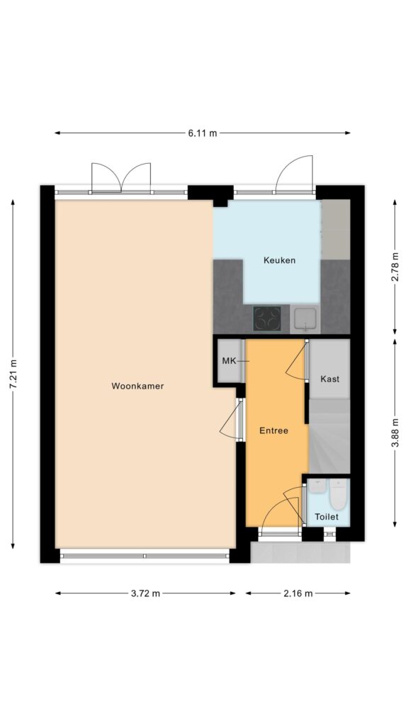 entree, hal, toilet, trapkast, meterkast, toegang tot de woonkamer. De woonkamer en keuken kenmerken zich door veel lichtinval, ook mede door de fraaie tegelvloer die er ligt. De begane grond heeft grotendeels elektrische vloerverwarming.