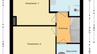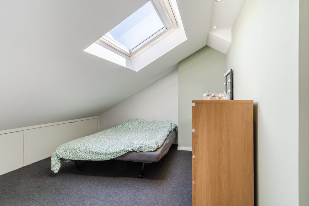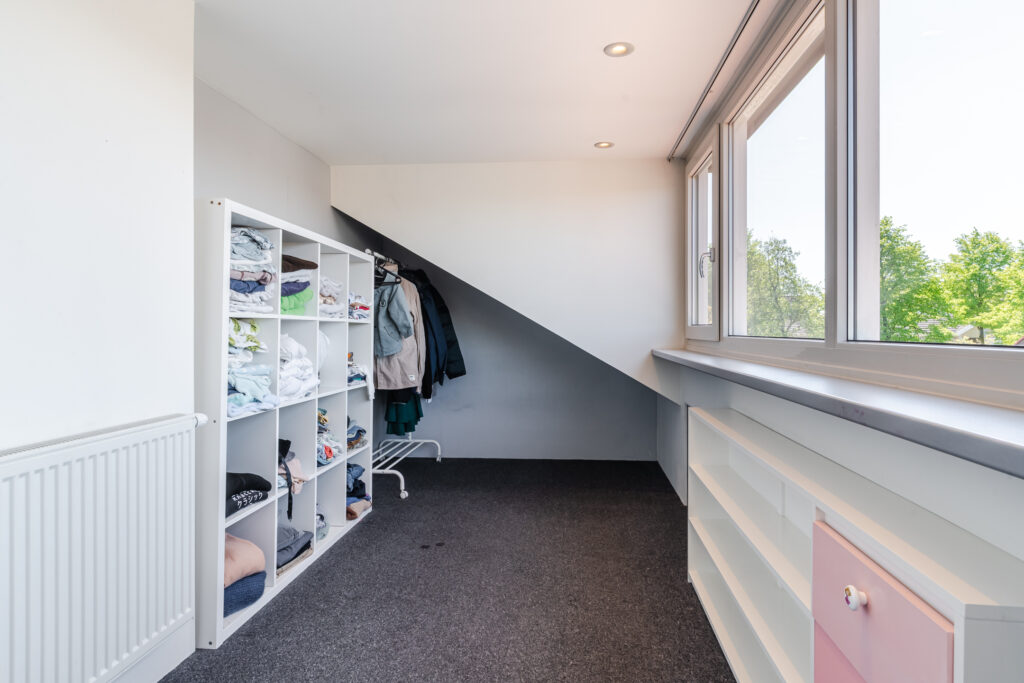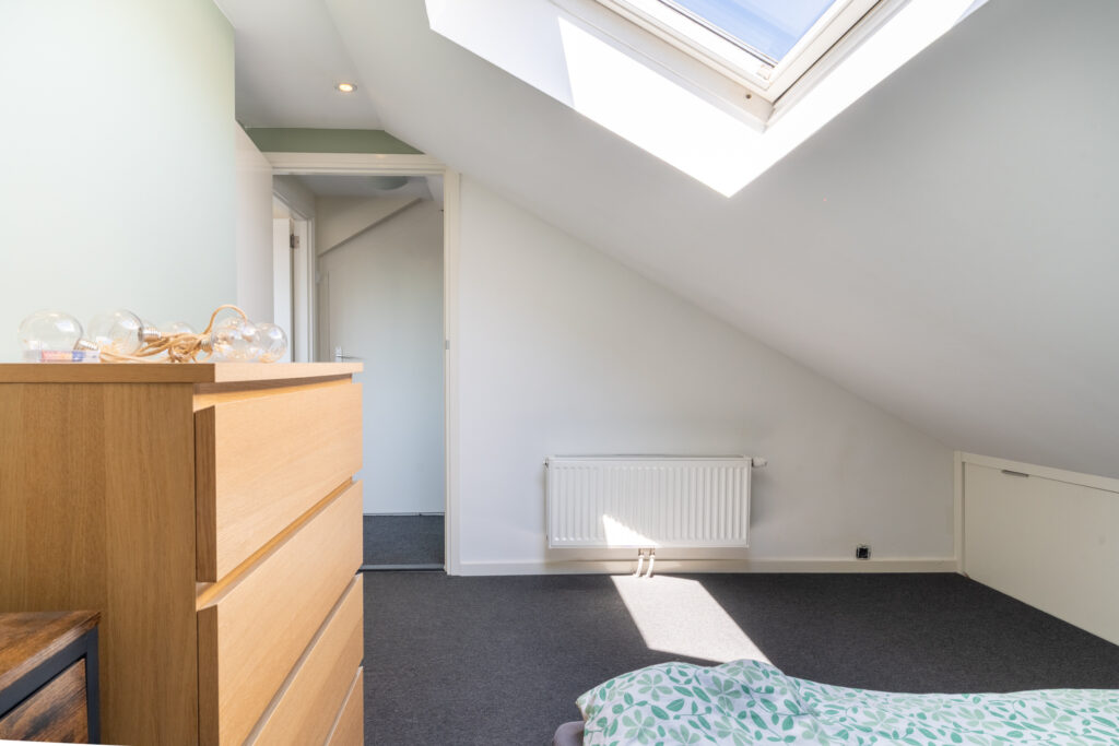 via vaste trap bereikbare ruime zolderverdieping. Deze verdieping is verdeeld in twee slaapkamers, waarbij aan de achterzijde een kunststof dakkapel is geplaatst.