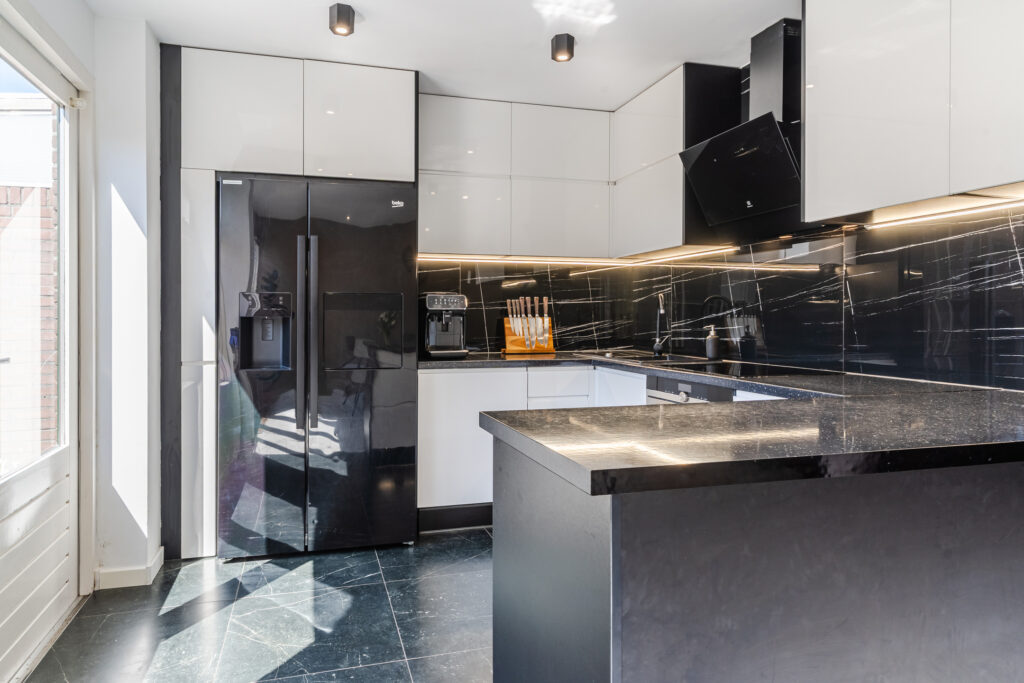 De keuken bevindt zich aan de achterzijde en is voorzien van een inductie kookplaat, afzuigkap, vaatwasser, combi- magnetron, koel-vriescombinatie en voldoende bergruimte.