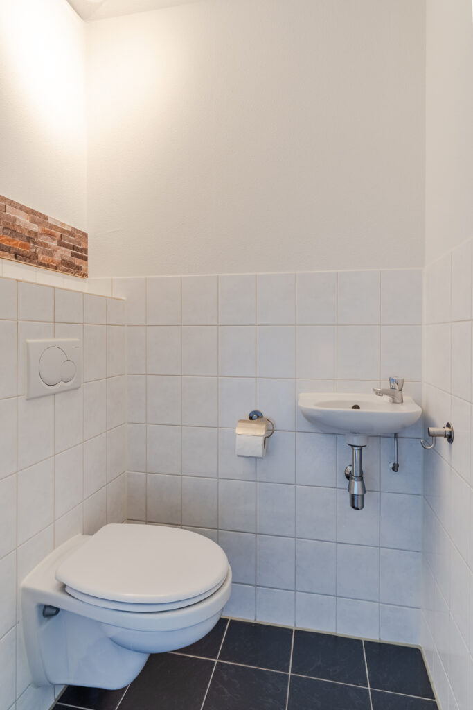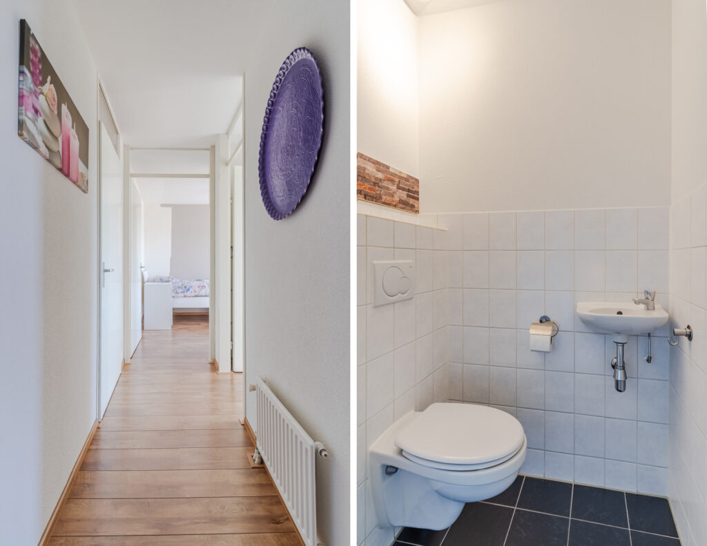 entree, gang met intercominstallatie en meterkast, keurig toilet met fonteintje.