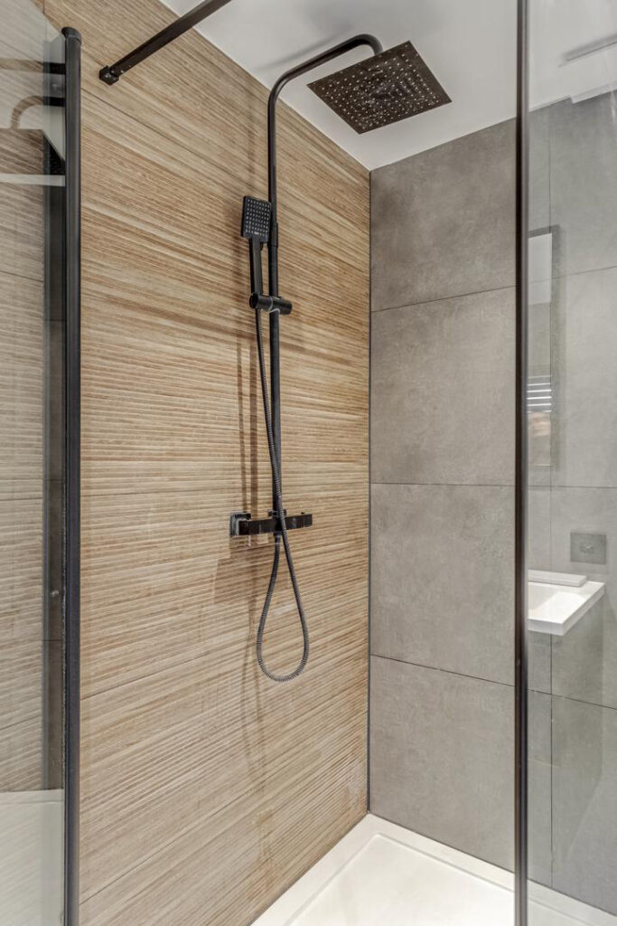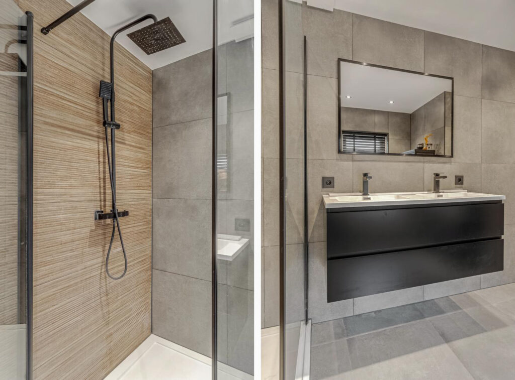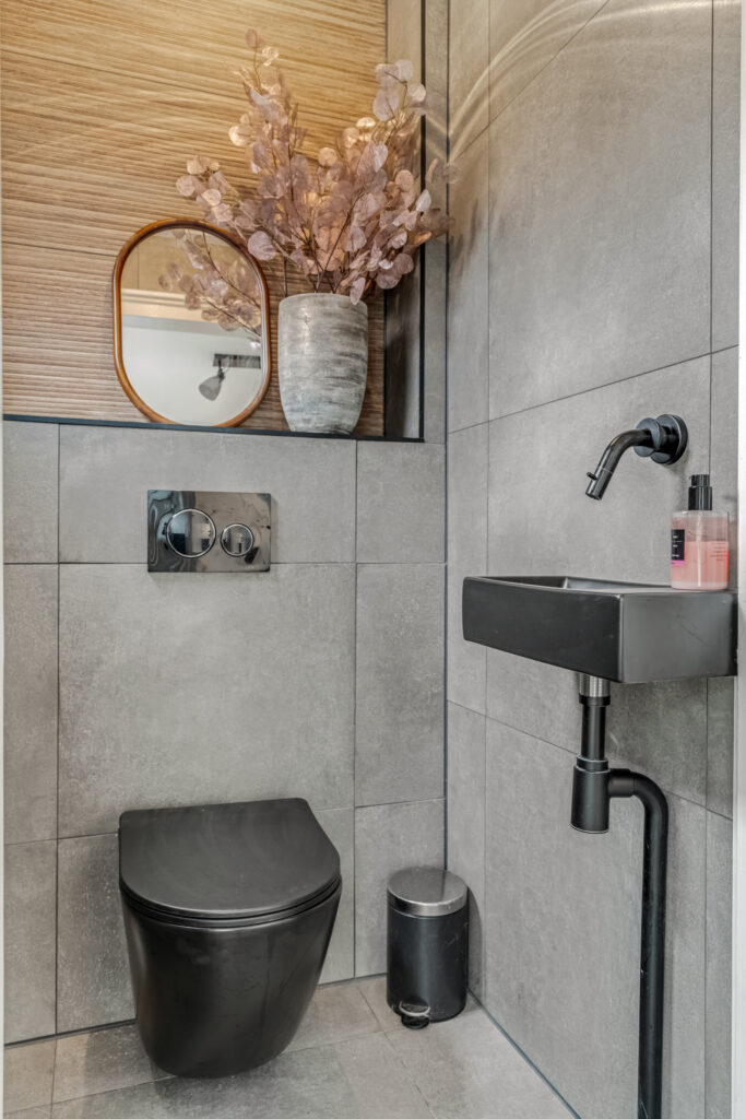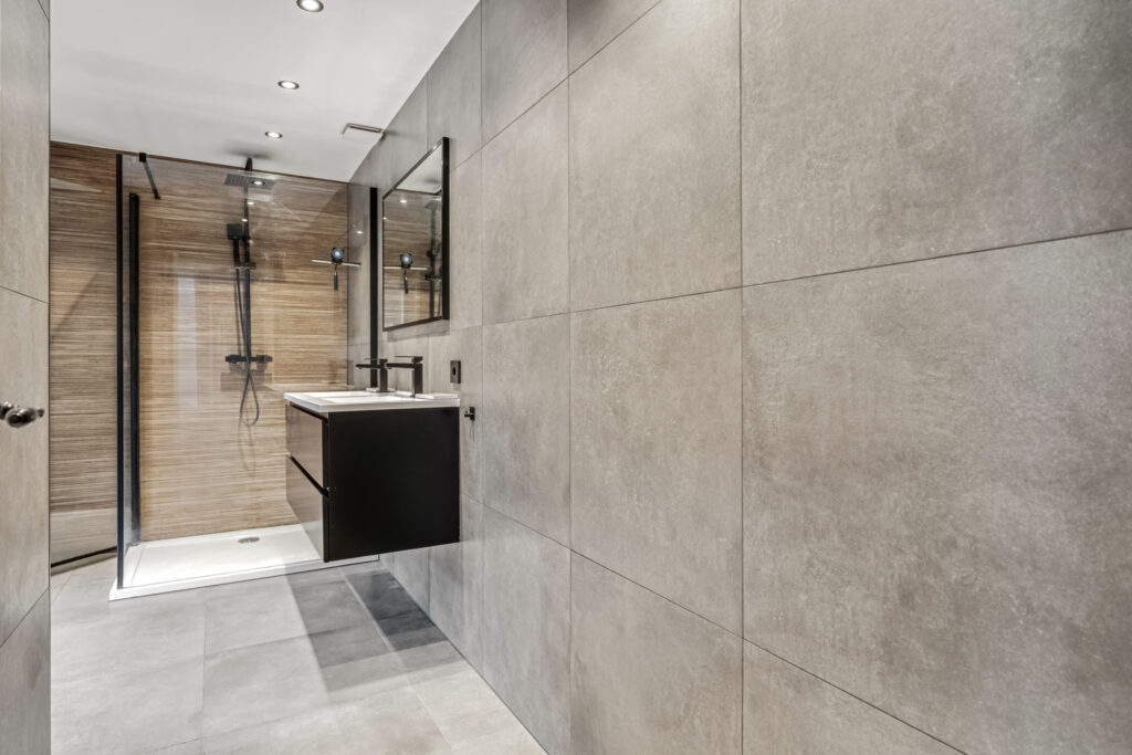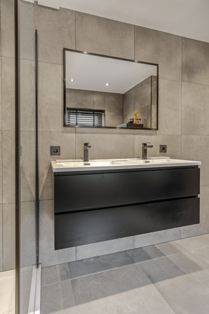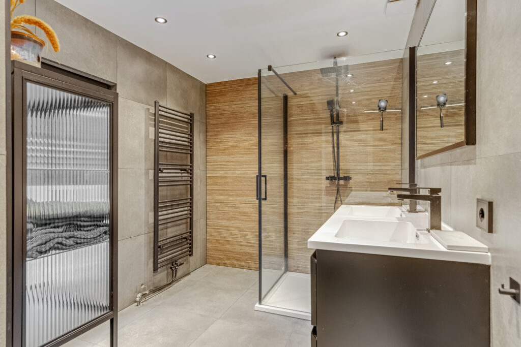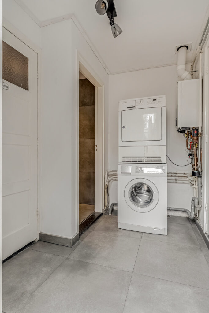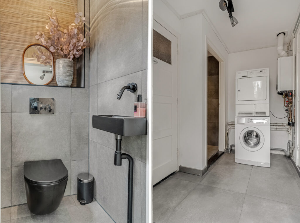 Via de keuken kom je in de bijkeuken welke is voorzien van een toilet (2023 ) en heb je toegang tot een moderne badkamer ( 2023 ) met een inloopdouche, dubbele vaste wastafel, vloer- wandtegels en een plafond met indirecte verlichting. en wandtegels en een plafond met indirecte verlichting. Hier bevindt zich ook een extra wasmachine-aansluiting.