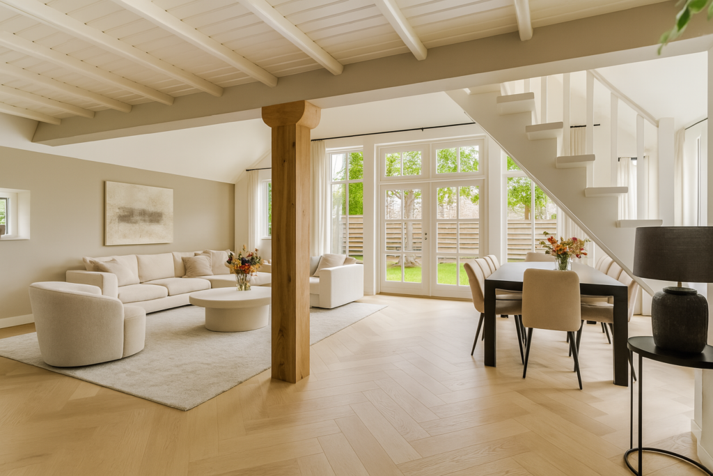De woonkamer is heerlijk ruim en heeft door de vele ramen een prachtige lichtinval. U kunt hier heerlijk zitten en relaxen.