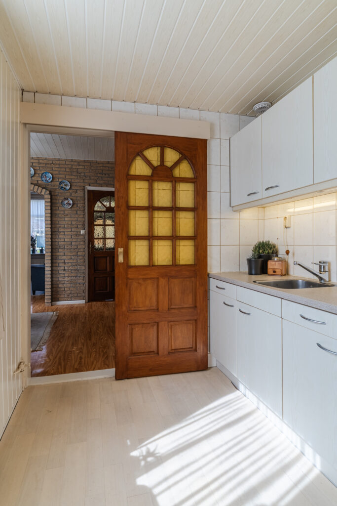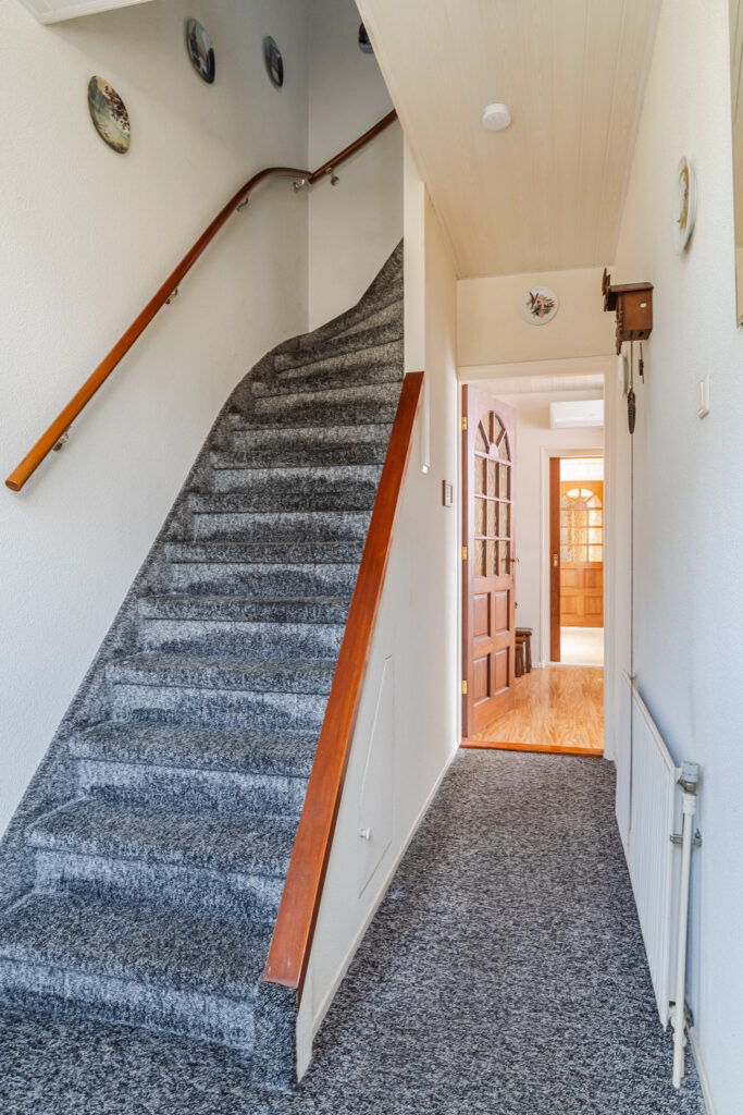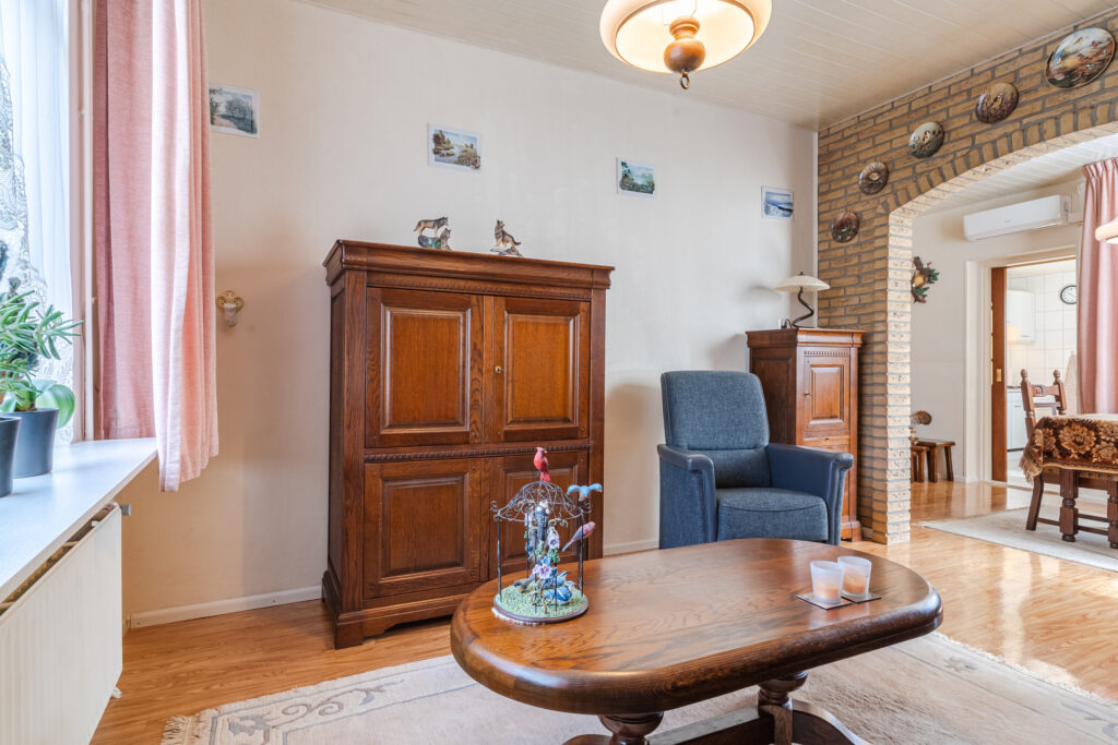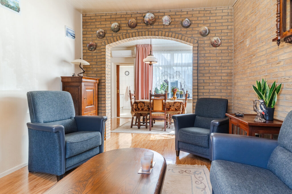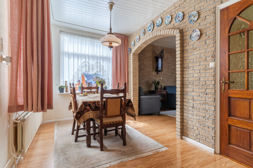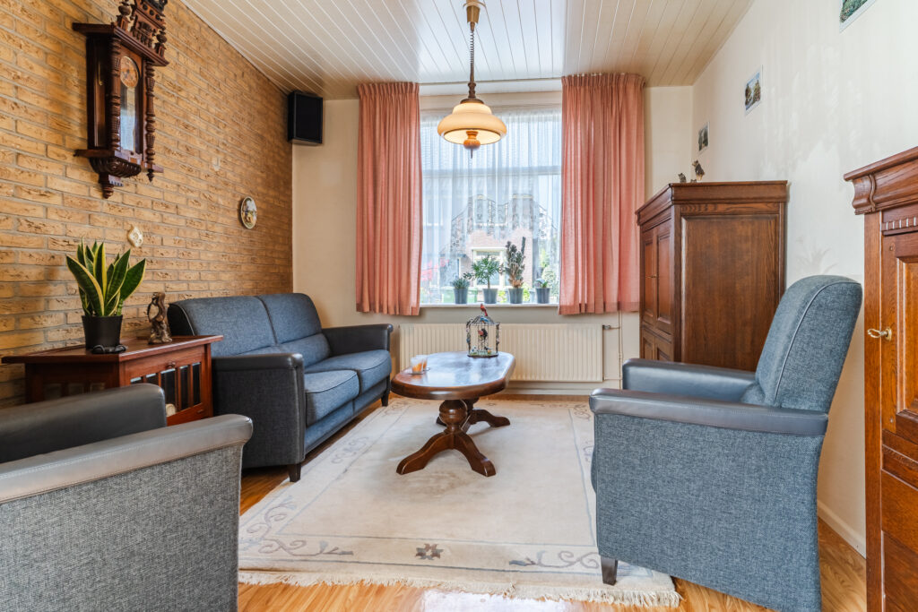 Entree, hal met meterkast en toegang tot de droge kelder — ideaal voor voorraad of extra bergruimte. Vanuit de hal kom je in de woonkamer, die prettig is ingedeeld met aan de voorzijde een fijne zithoek en aan de achterzijde ruimte voor een eettafel.