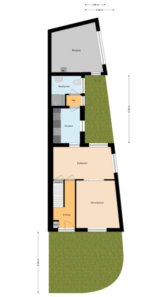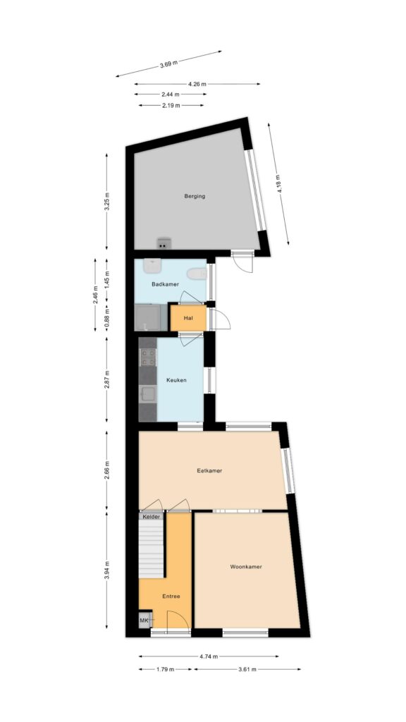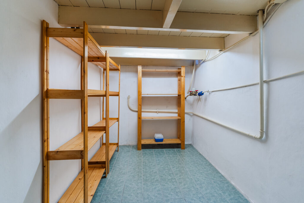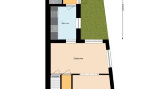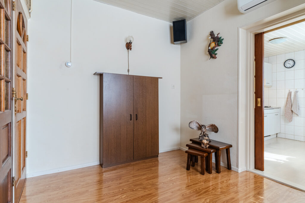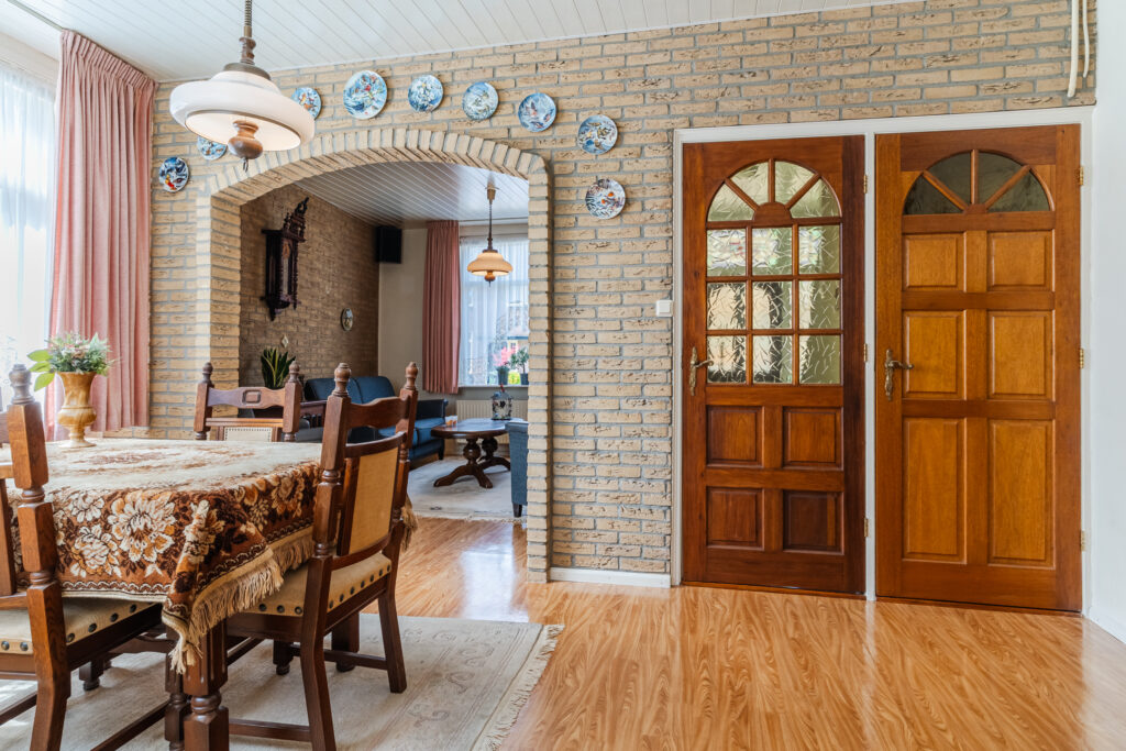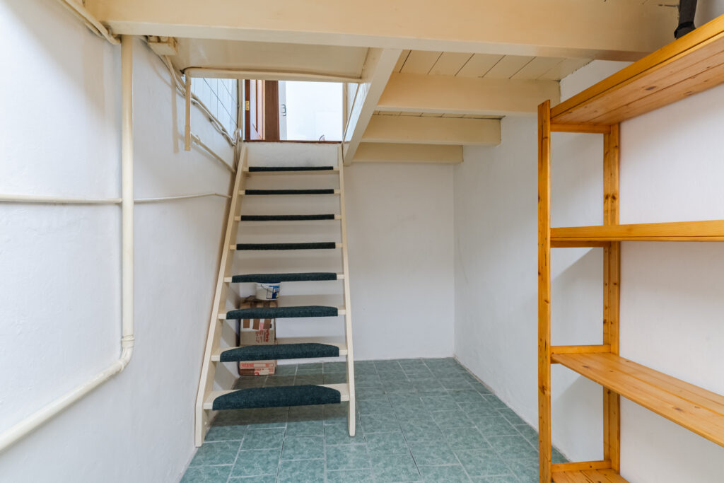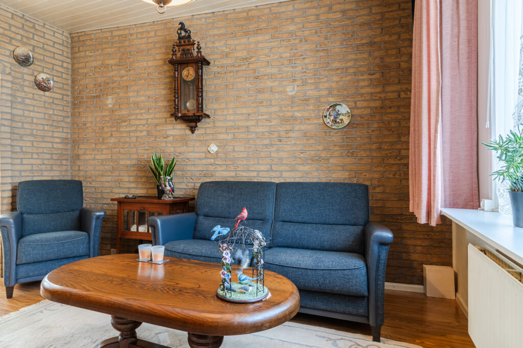 Entree, hal met meterkast en toegang tot de droge kelder — ideaal voor voorraad of extra bergruimte. Vanuit de hal kom je in de woonkamer, die prettig is ingedeeld met aan de voorzijde een fijne zithoek en aan de achterzijde ruimte voor een eettafel.