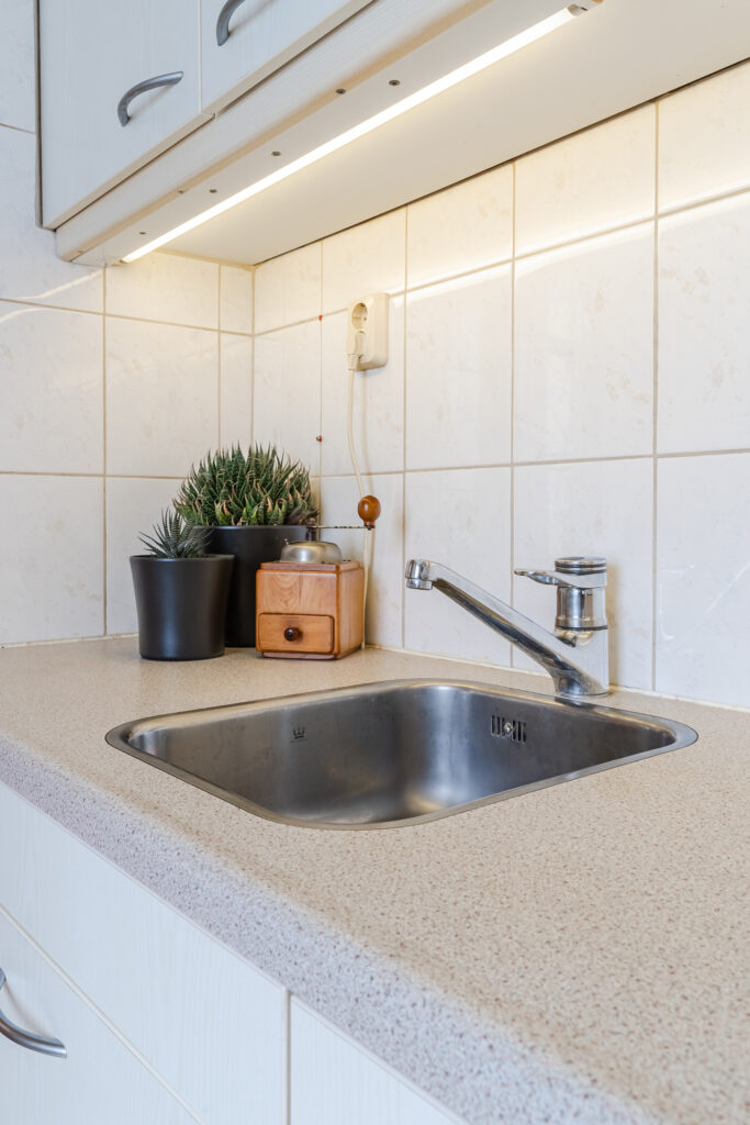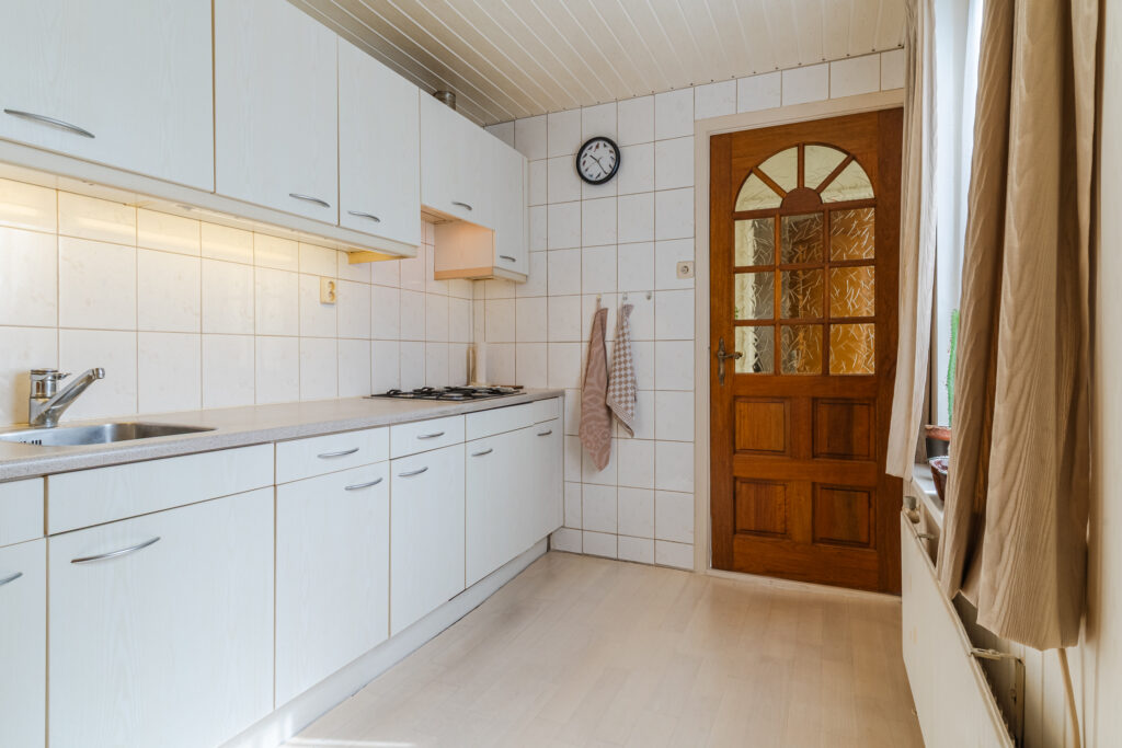 De keuken is netjes uitgevoerd en voorzien van een 4-pits gaskookplaat, afzuigkap, koelkast en voldoende bergruimte.