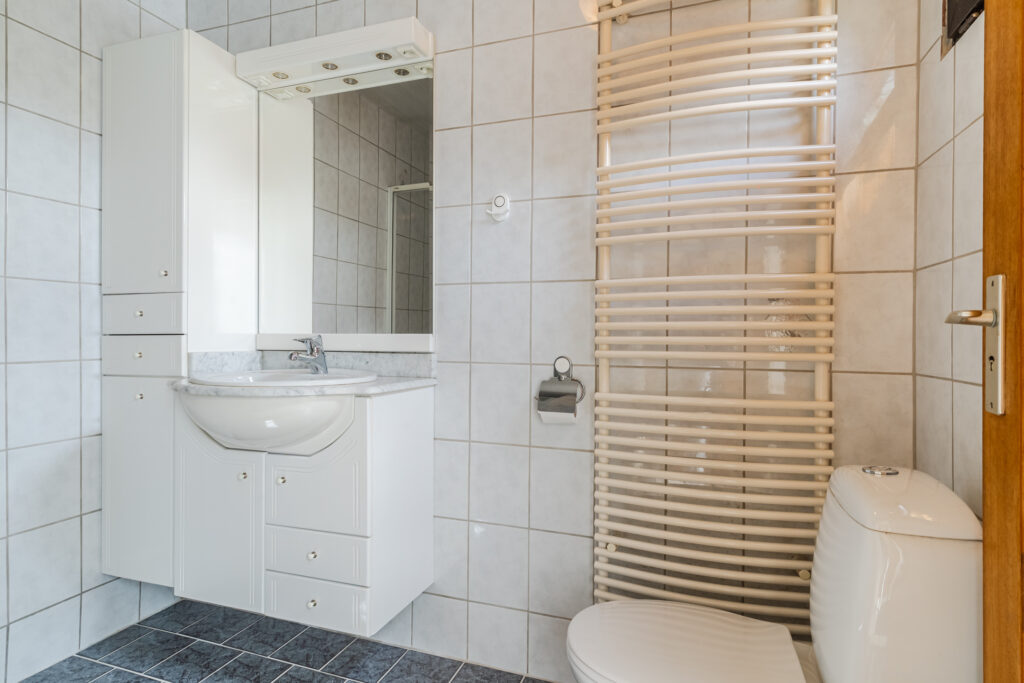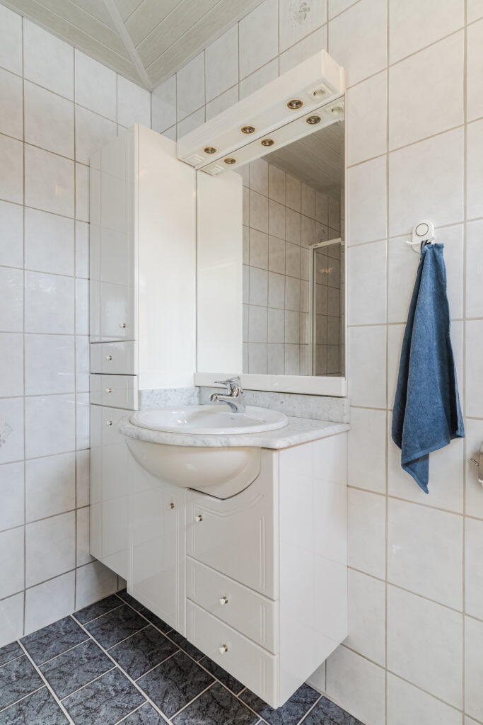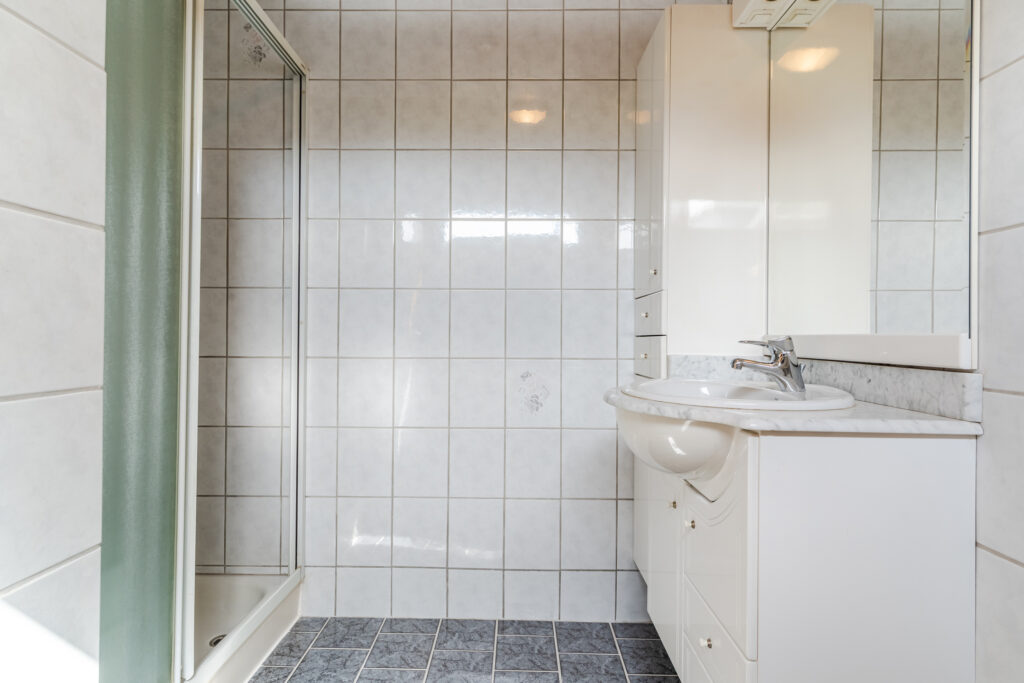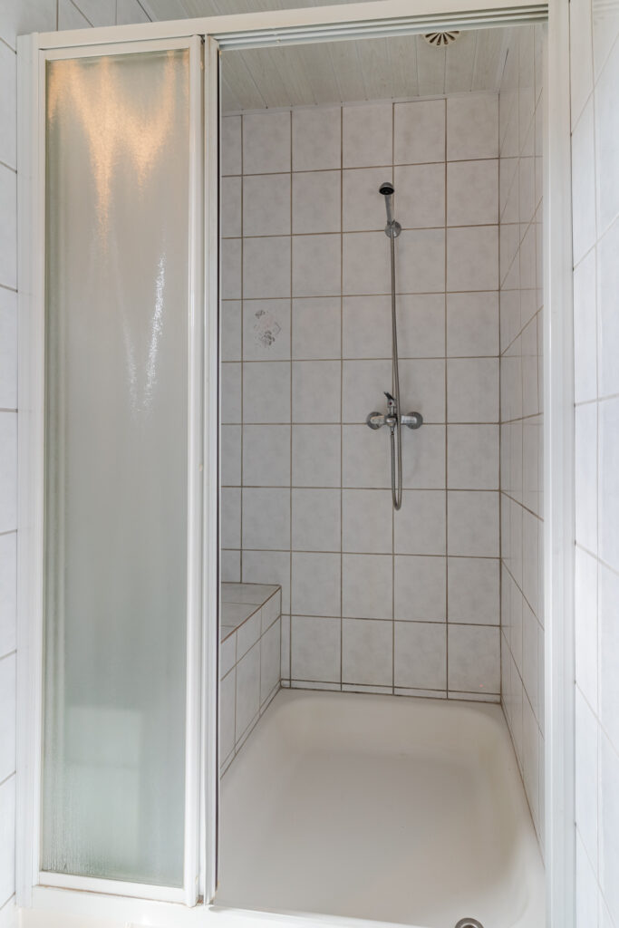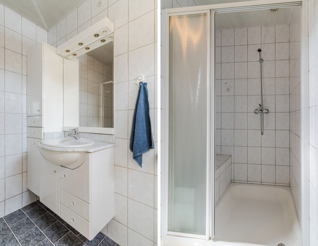 Aan de achterzijde bevindt zich het sanitair met douche, wastafelmeubel en toilet.