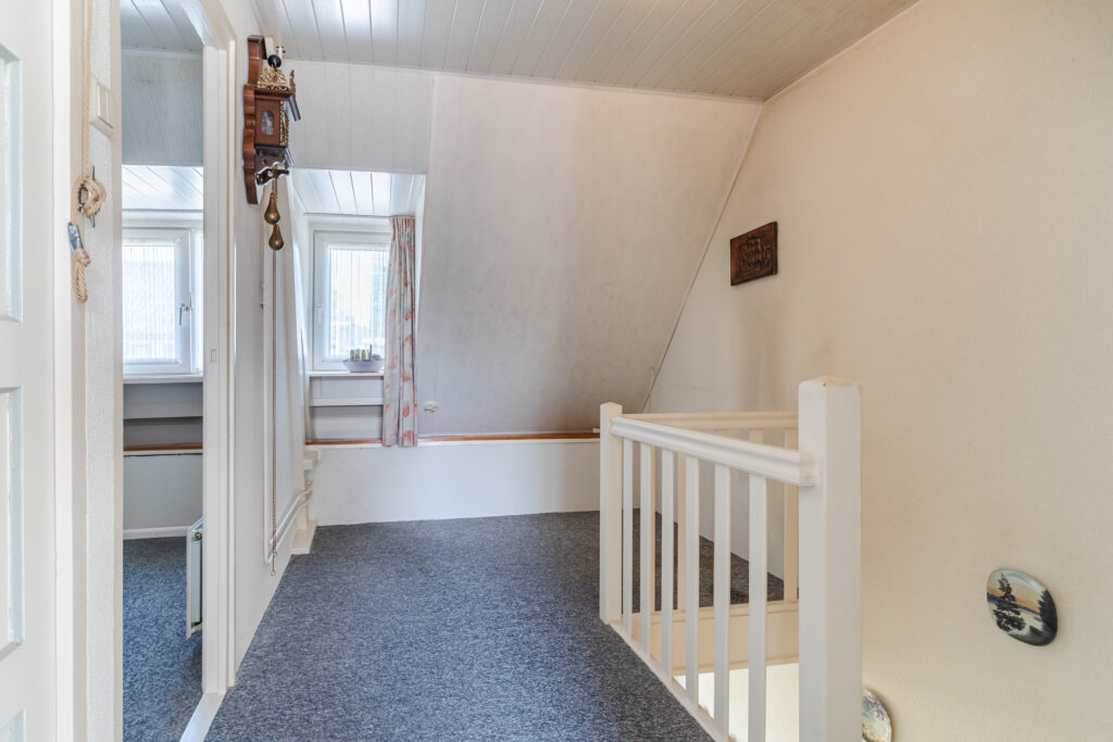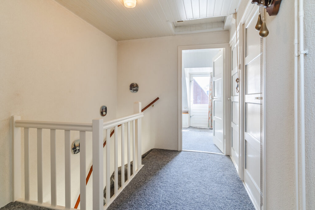Overloop met toegang tot drie slaapkamers. De grootste slaapkamer aan de voorzijde is voorzien van airconditioning en een screen voor extra comfort tijdens warme dagen.
