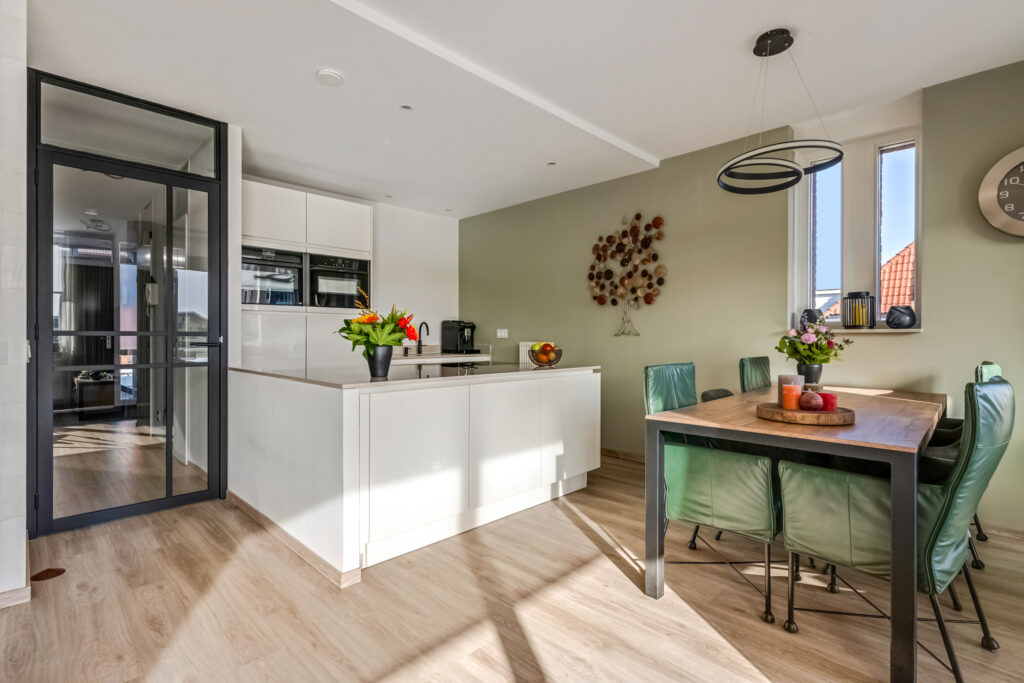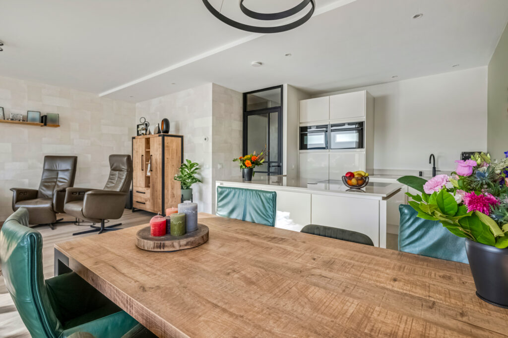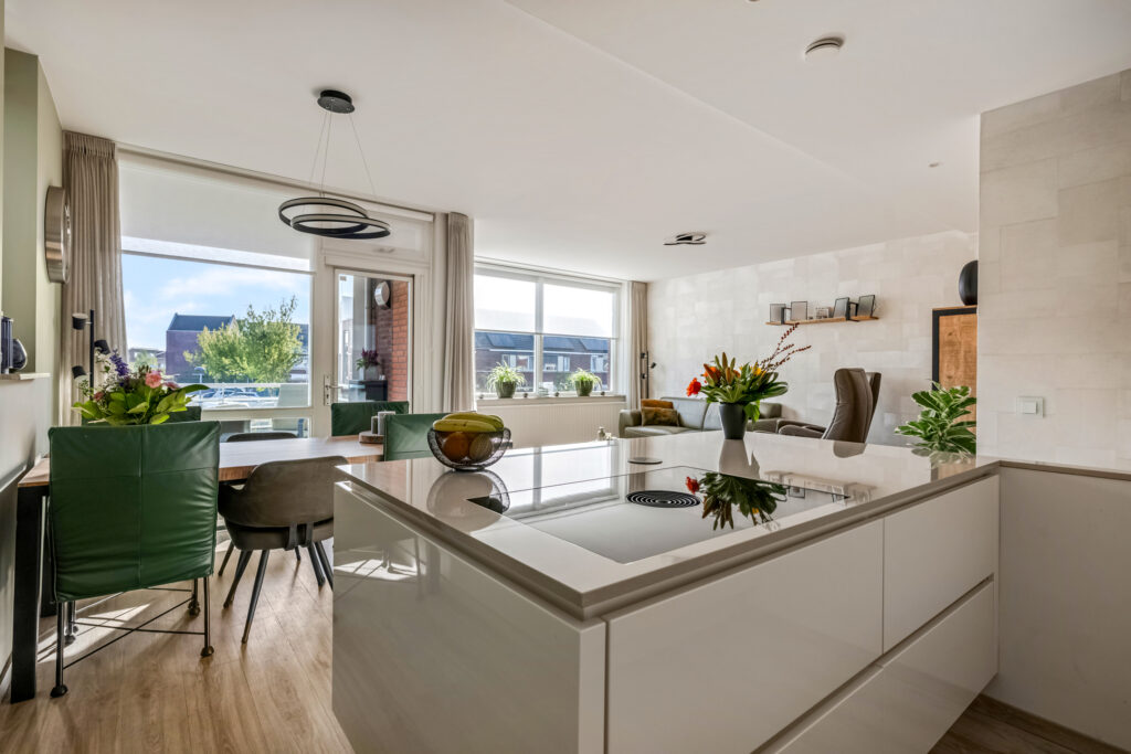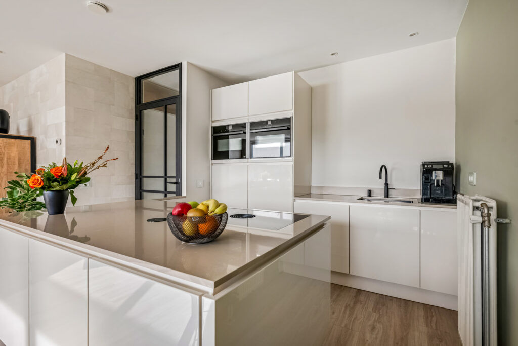 Woonkamer met toegang tot balkon en prachtige open keuken v.v. inductie kookplaat met geïntegreerde afzuiginstallatie, Quooker, koelkast, vaatwasmachine, oven, combi magnetron, zeeppompje, veel bergruimte en fraai aanrechtblad.