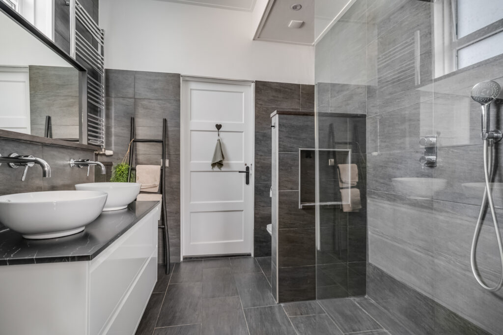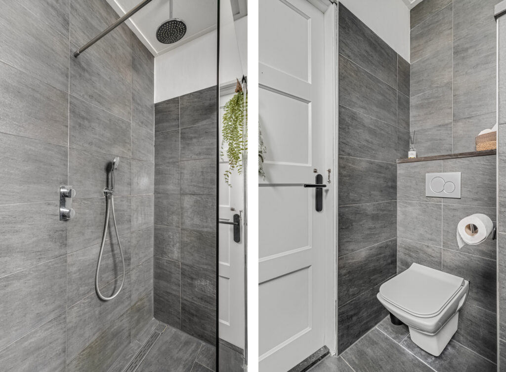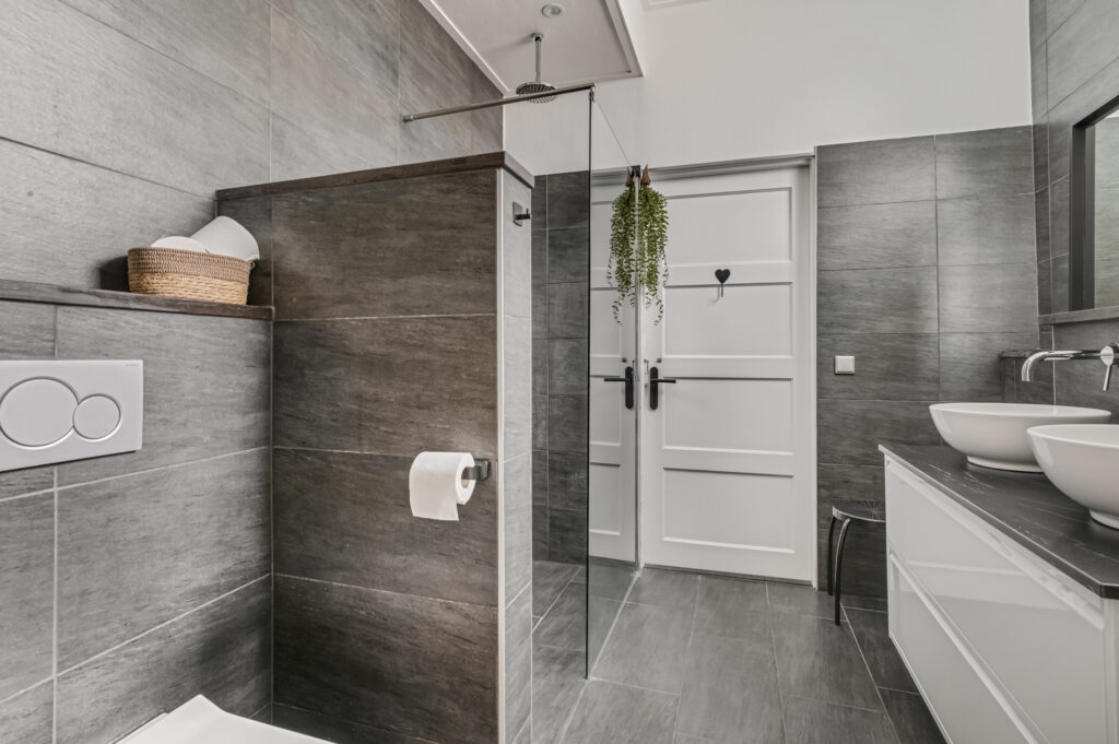 overloop, 2 tal ruime slaapkamers, elk met een binnendoor naar de luxe badkamer voorzien van 2e toilet, dubbele vaste wastafel, inloopdouche en fraaie vloer- en wandtegels.