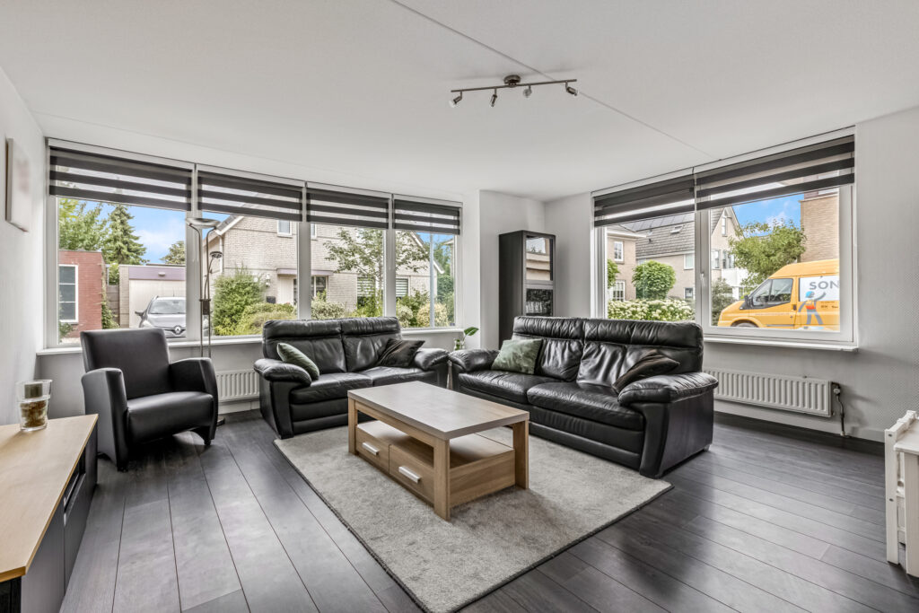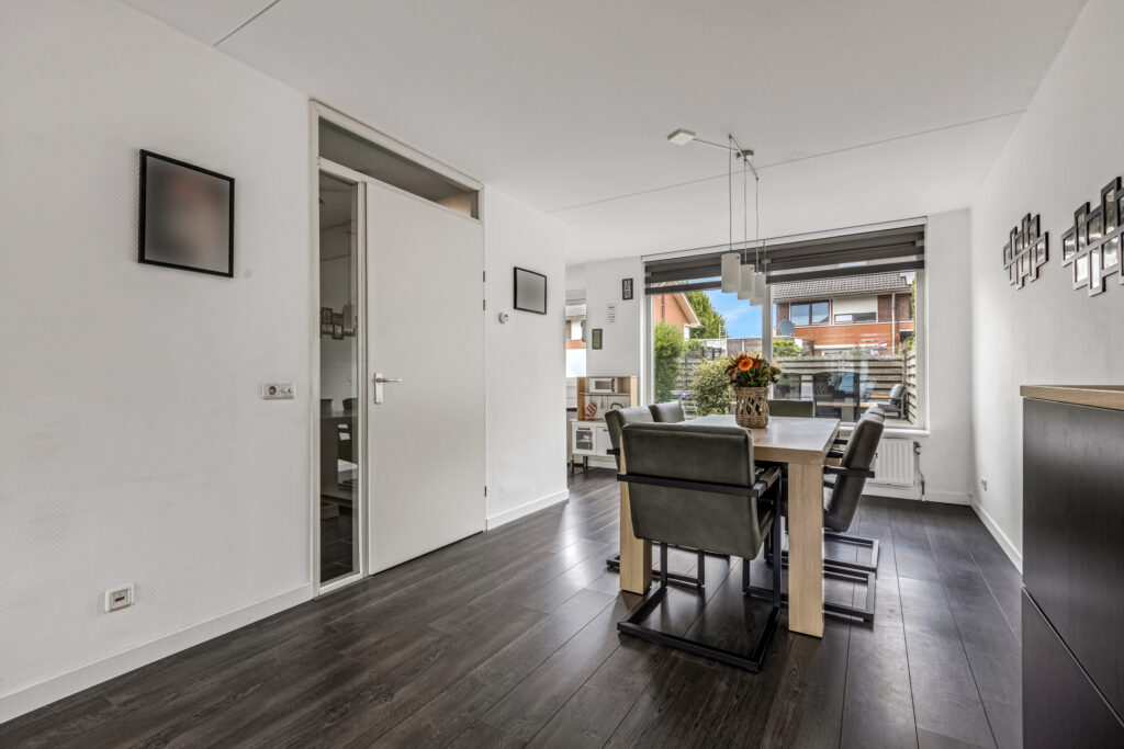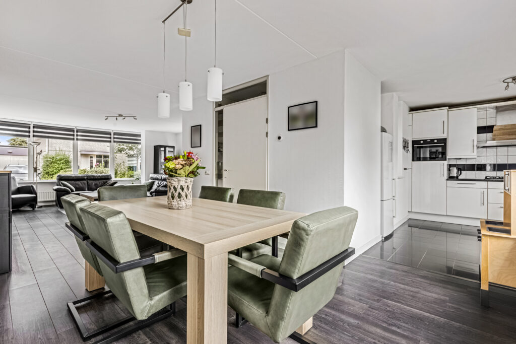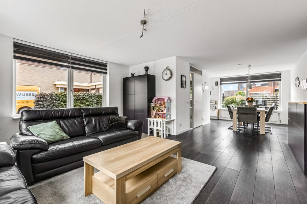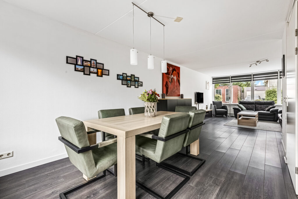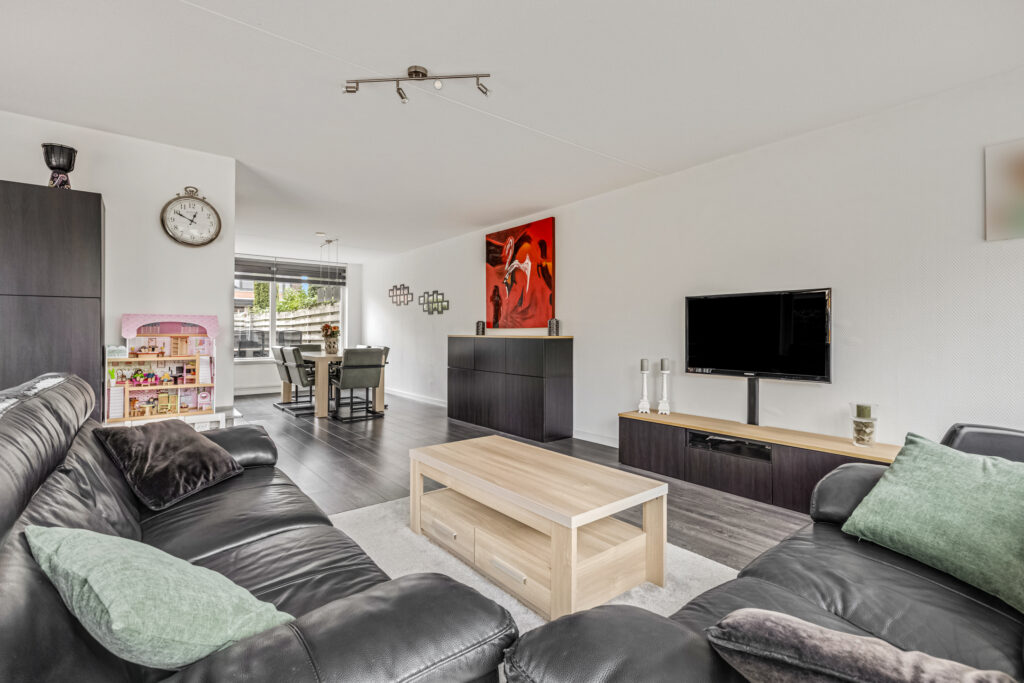 De ruime woonkamer en keuken vormen samen een fijne leefruimte waar het gezin centraal staat.