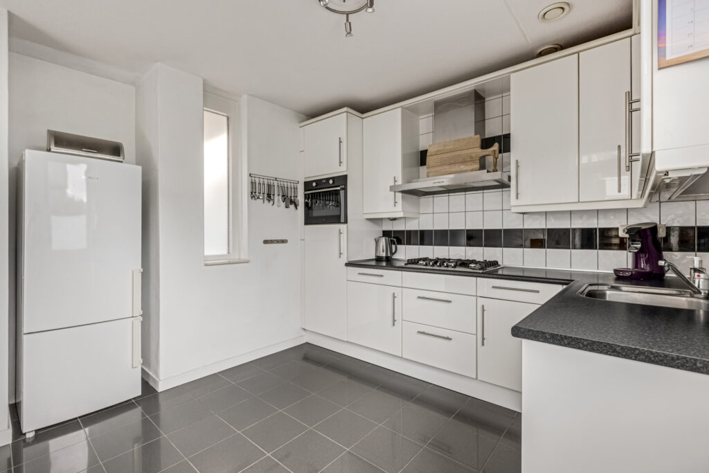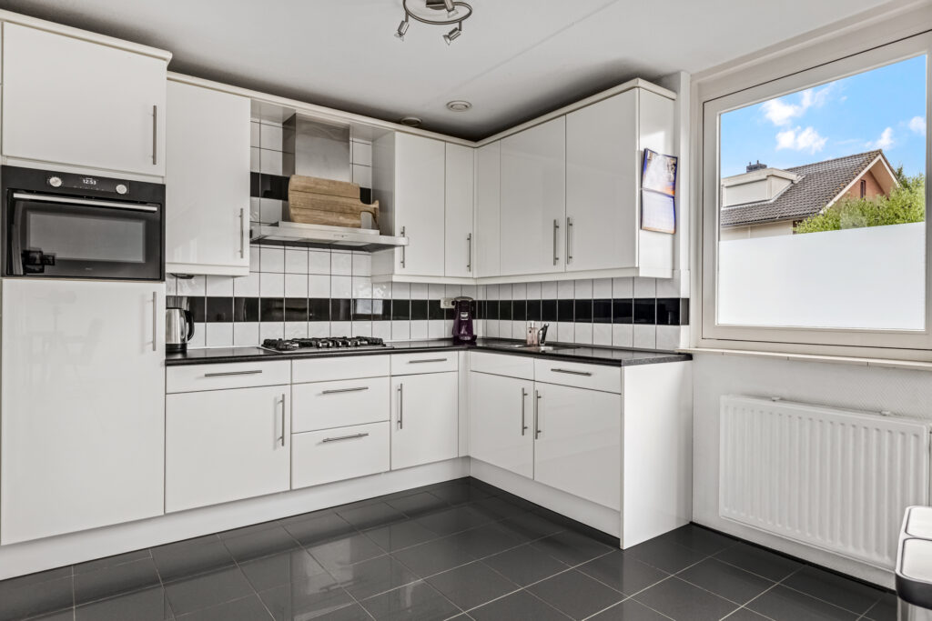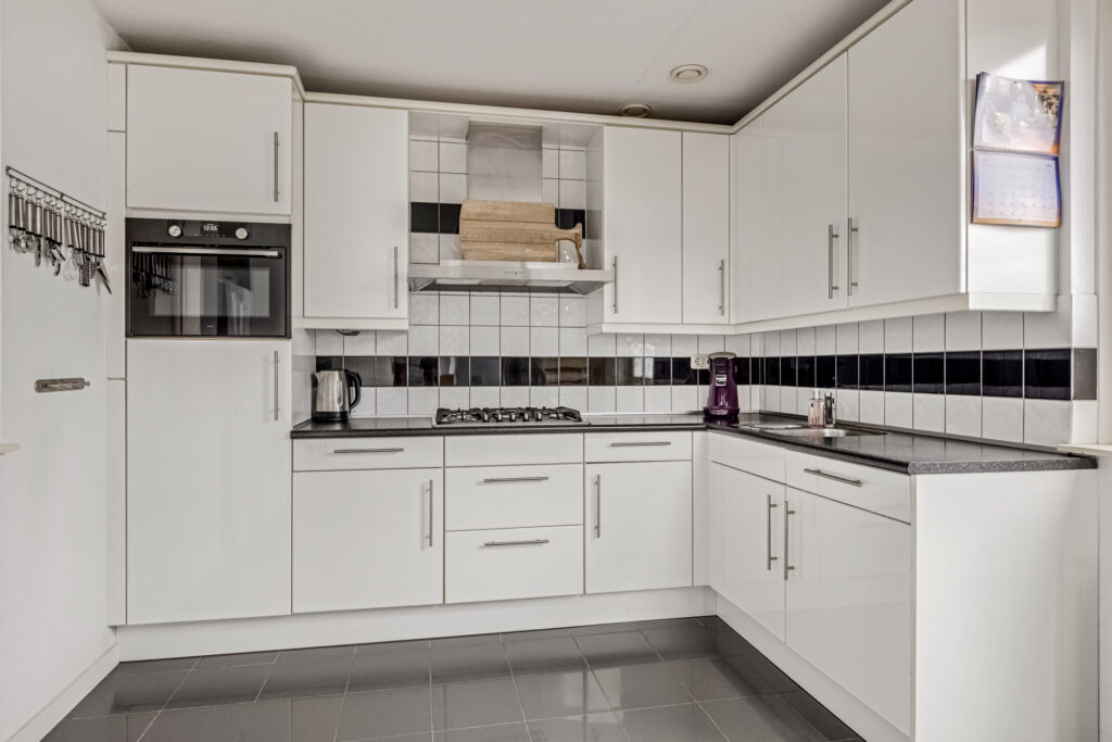 De keuken bevindt zich aan de achterzijde en is nagenoeg compleet te noemen: een 5-pits gaskookplaat, afzuigkap, combi-oven, vaatwasser en voldoende bergruimte. Er is plek gemaakt voor een mooie (Amerikaanse) koel-vriescombinatie.