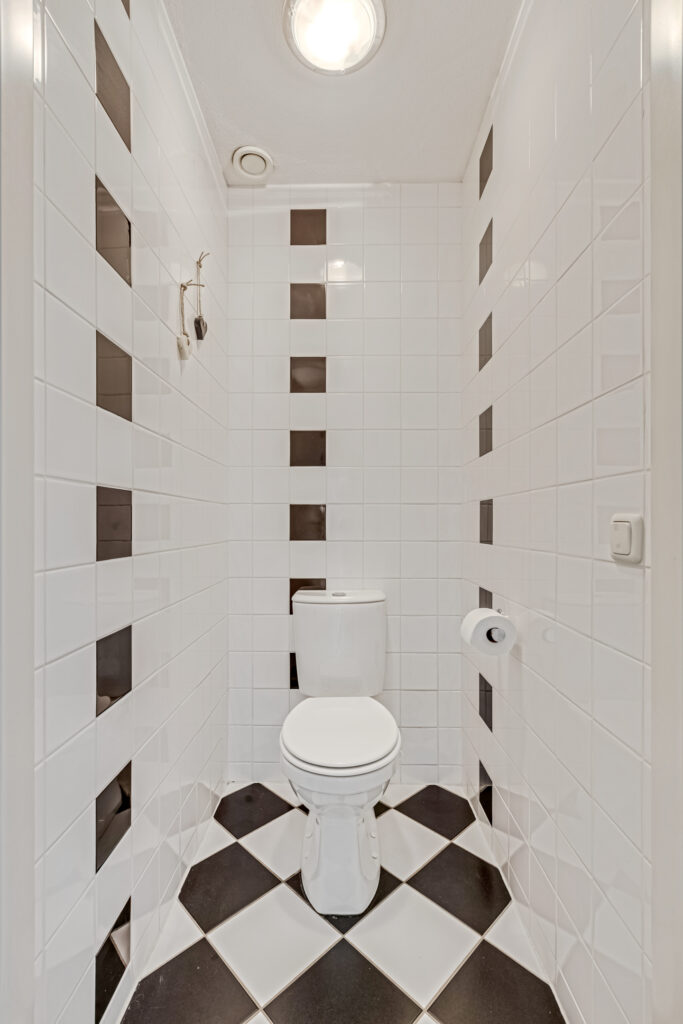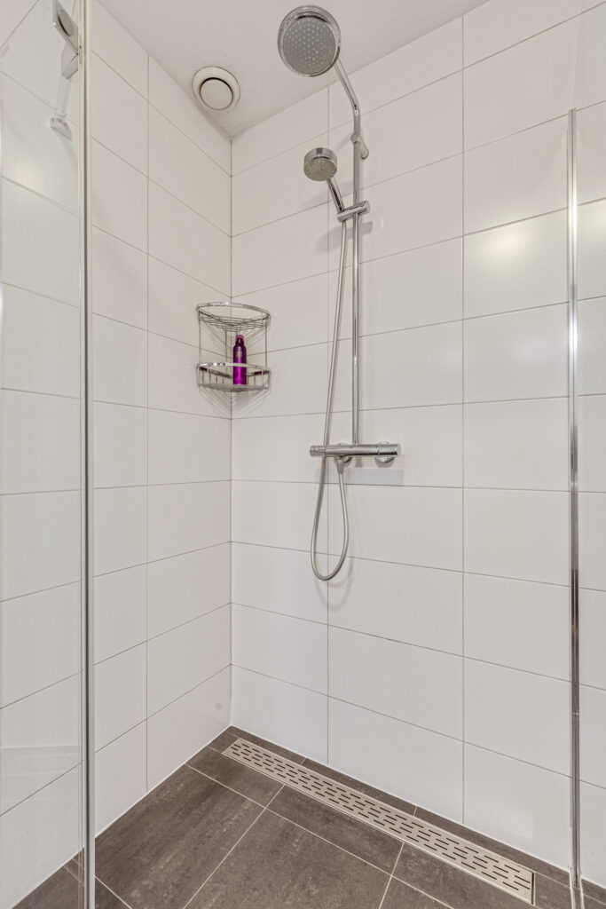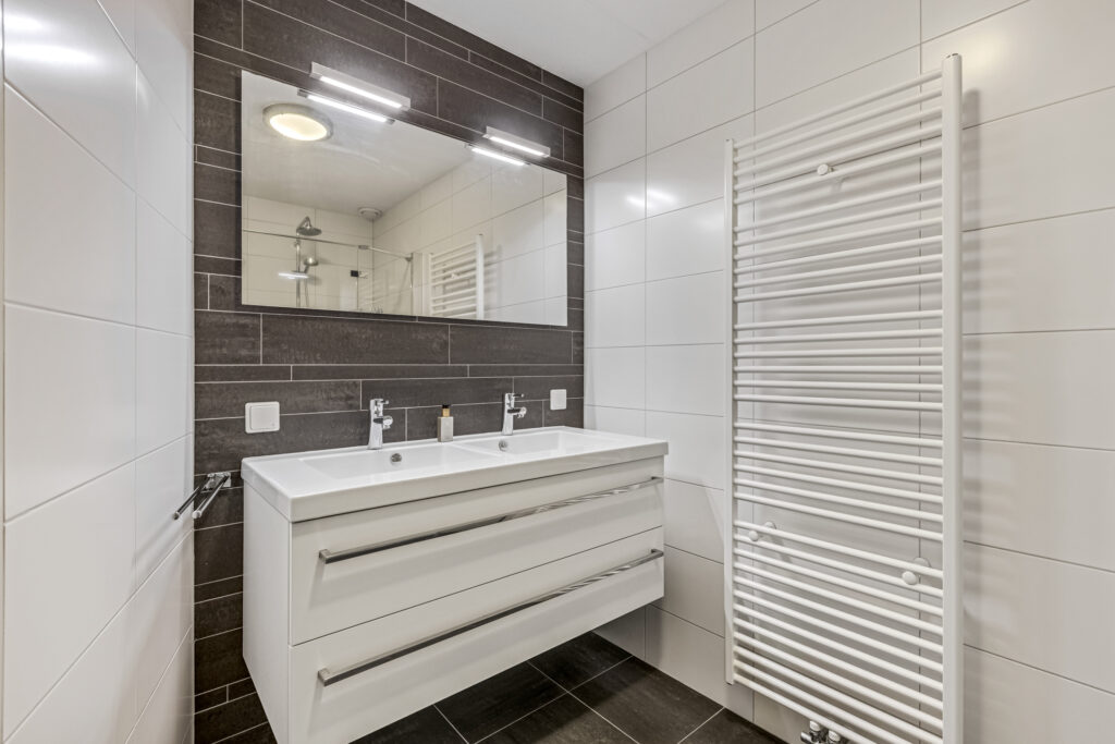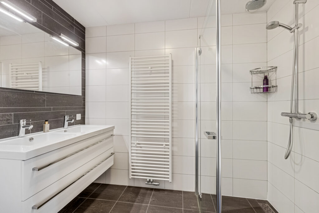 De badkamer bevindt zich in het midden en is voorzien van een inloopdouche en dubbele vaste wastafel. De badkamer is geheel betegeld en voorzien van mechanische ventilatie.