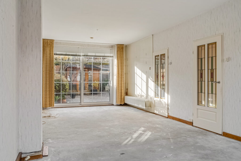 De woonkamer is heerlijk licht door beide raampartijen aan voor – en achterzijde. Via een schuifpui is de achtertuin te bereiken.