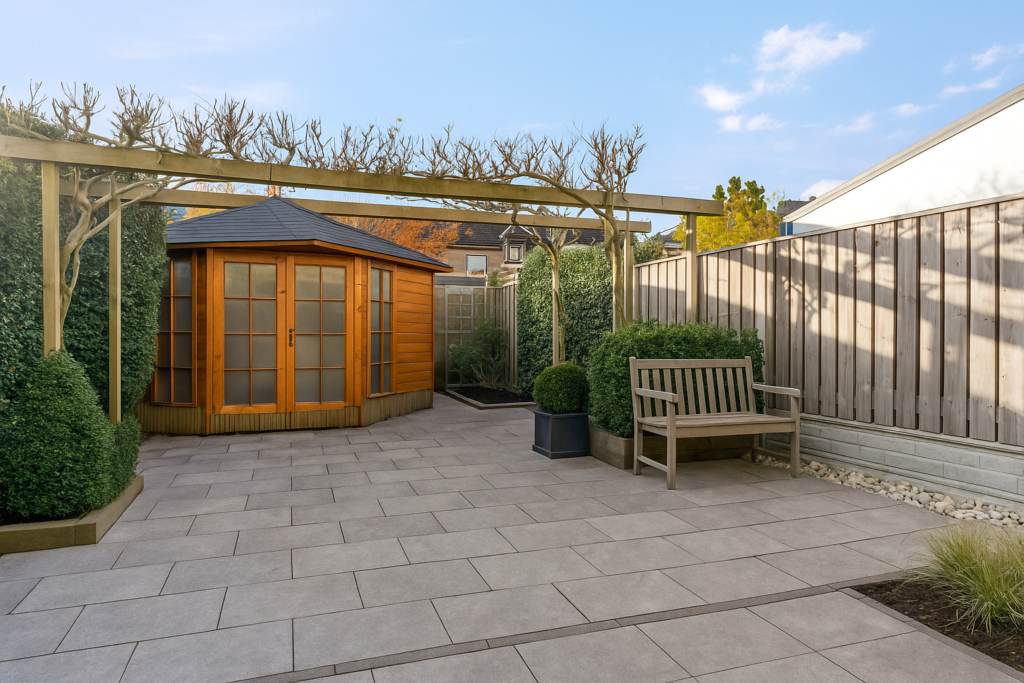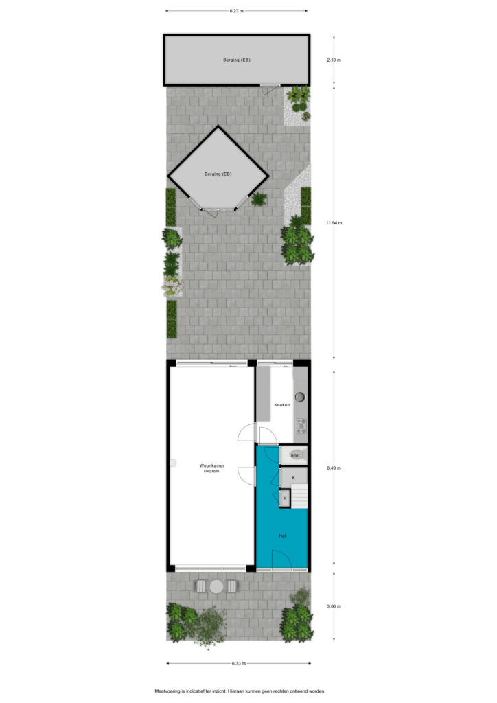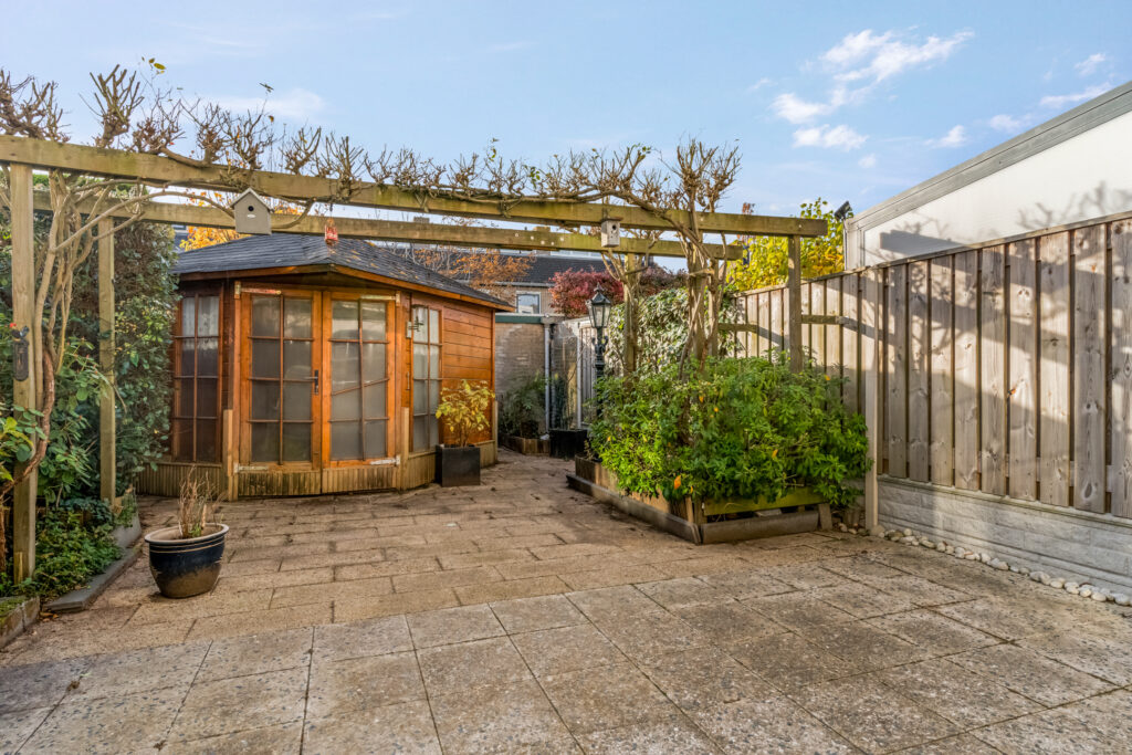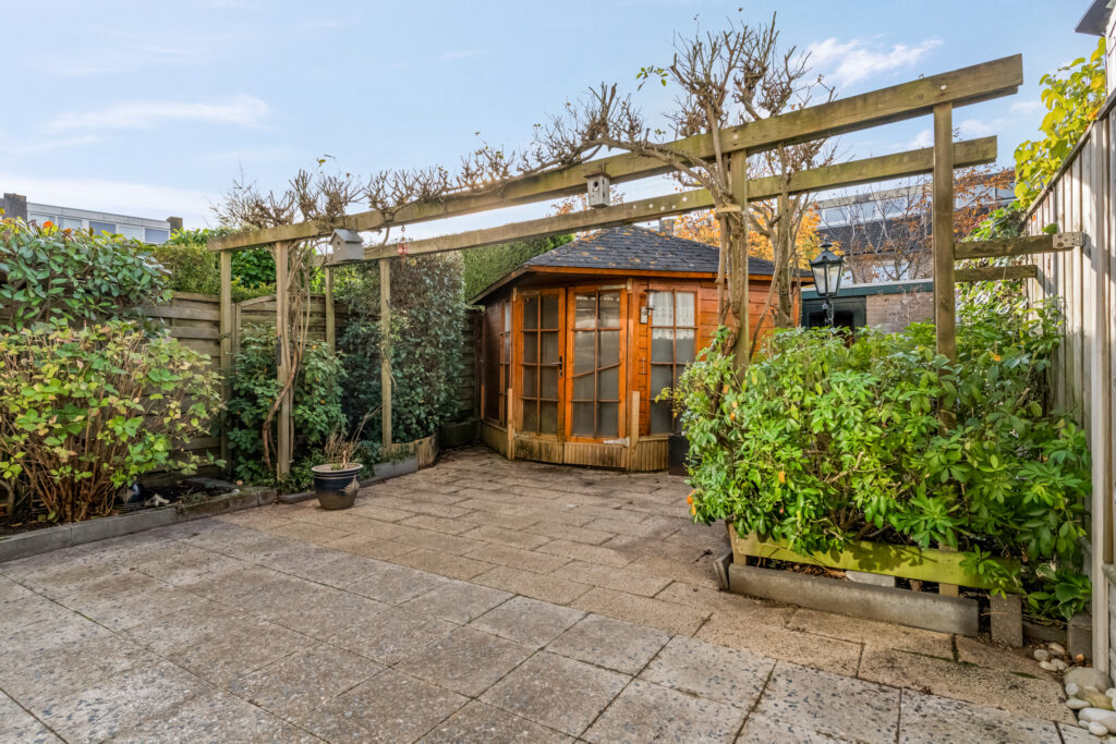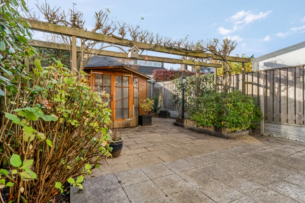 zowel voor – als achtertuin heeft een zonnescherm en in de achtertuin bevinden zich een tweetal schuren met elektra. De achtertuin ligt op het zuid- westen en hierdoor is de middag – en avondzon goed aanwezig.