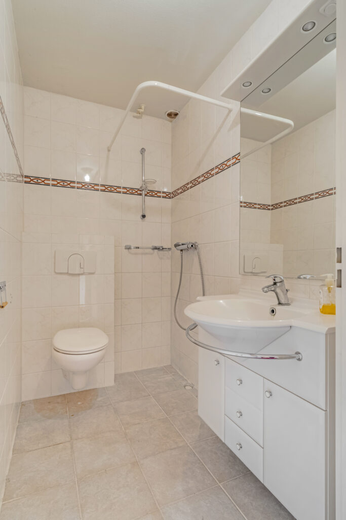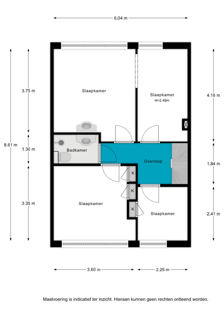 overloop met toegang tot drie (voormalig vier) slaapkamers. De badkamer is voorzien van een inloopdouche, toilet en vaste wastafel.