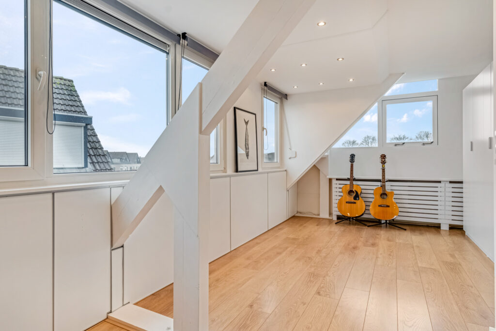 op zolder is een kunststof dakkapel met screens geplaatst. Hierdoor ontstaat ofwel een mooie slaapkamer of fijne plek om thuis te werken. Op deze verdieping bevindt zich ook het technisch deel van de woning met opstelling hybride warmtepomp / CV en ook de witgoedaansluitingen zijn hier te vinden.