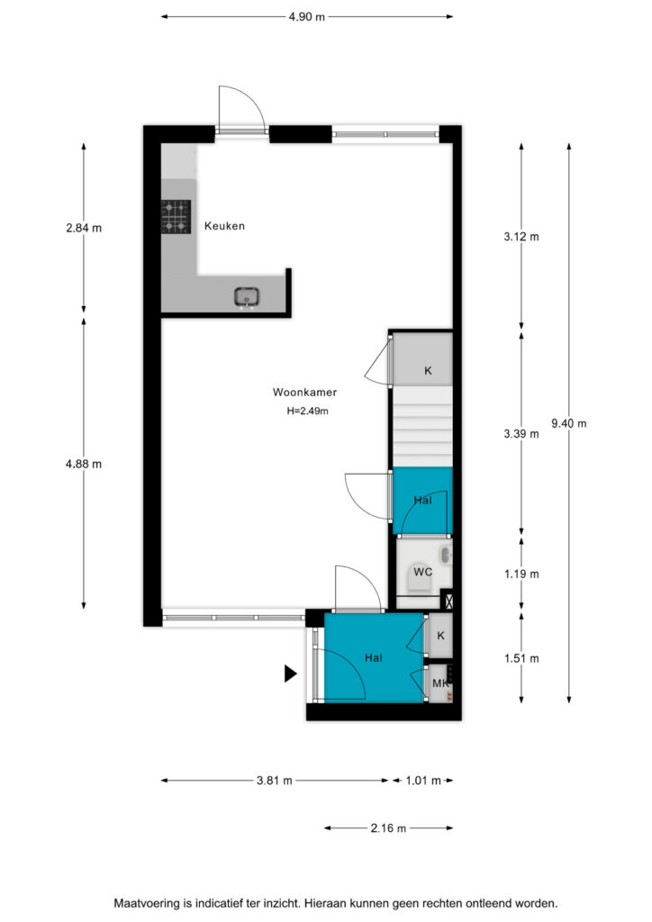 entree, hal, meterkast, toegang tot woonkamer. Keuken is voorzien van inductie kookplaat, afzuigkap, magnetron, oven, koelkast, vaatwasser en voldoende bergruimte. Bij de trapopgang naar de 1e verdieping bevindt zich het toilet.