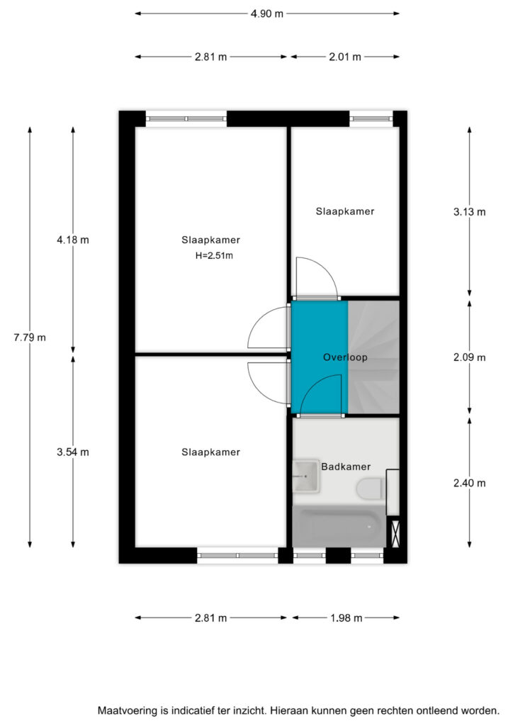 overloop met toegang tot drie slaapkamers. Badkamer voorzien van ligbad, douchecabine, vaste wastafel en toilet.