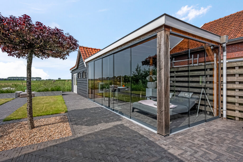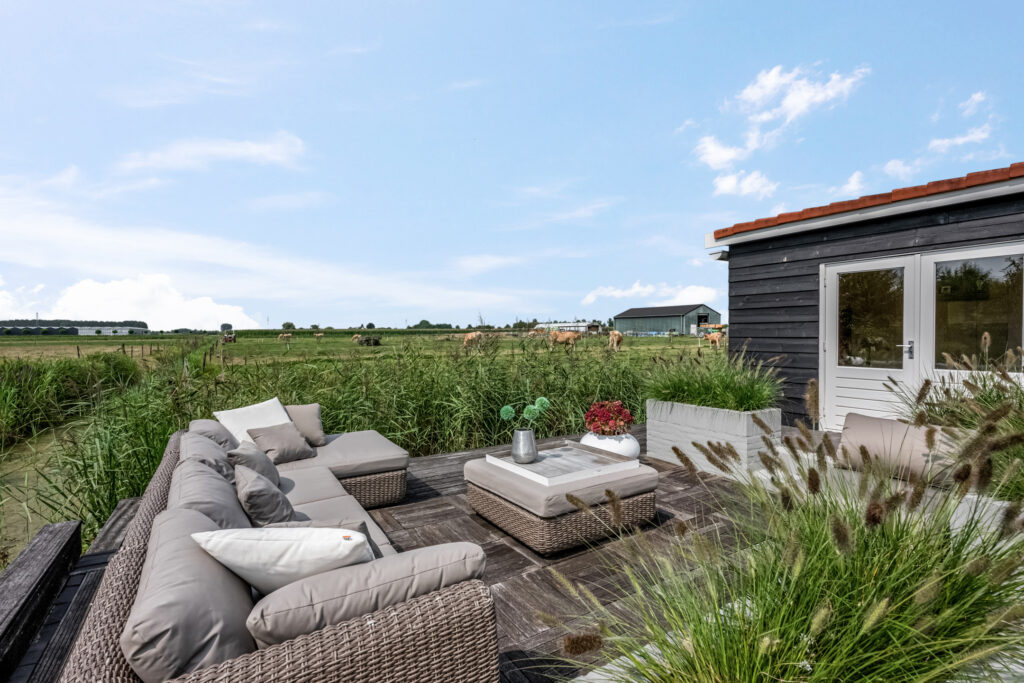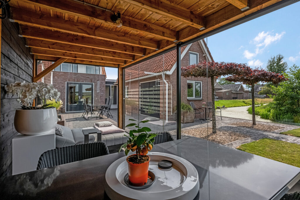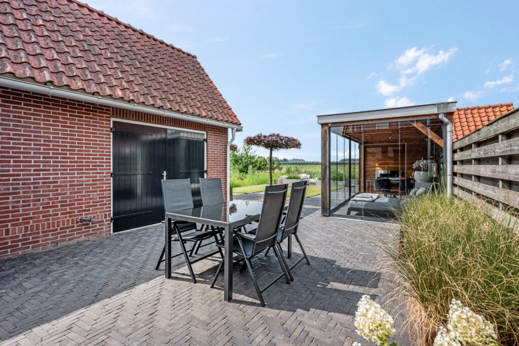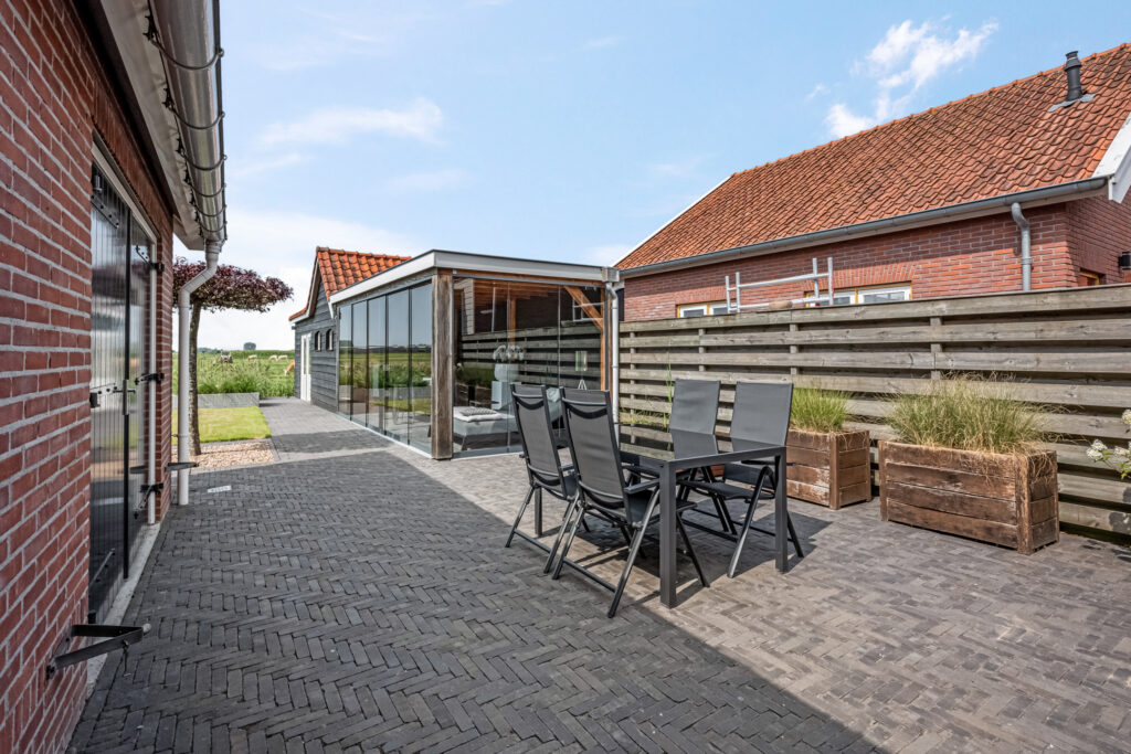Buiten gaat het landelijke wonen pas echt leven: een ruime veranda met glaswanden en een terras waar je elk seizoen het uitzicht over de weilanden beleeft. Hier verveelt het beeld nooit – van grazende koeien in de zomer tot weidse vergezichten in de winter. Ook in de avonduren is het hier genieten van de ondergaande zon!