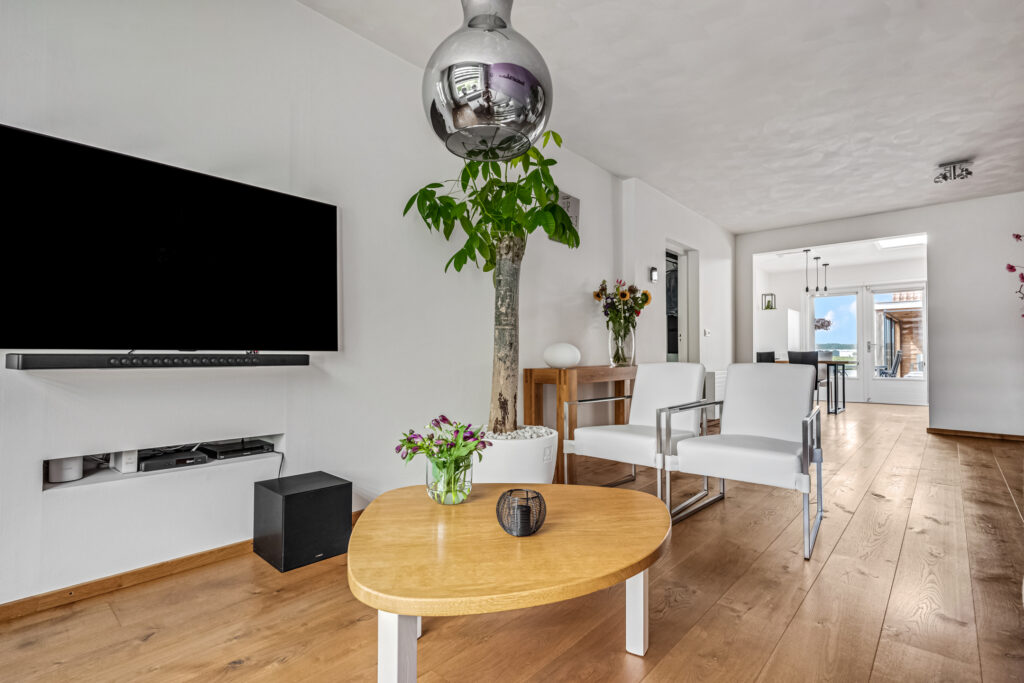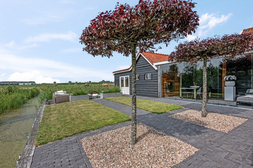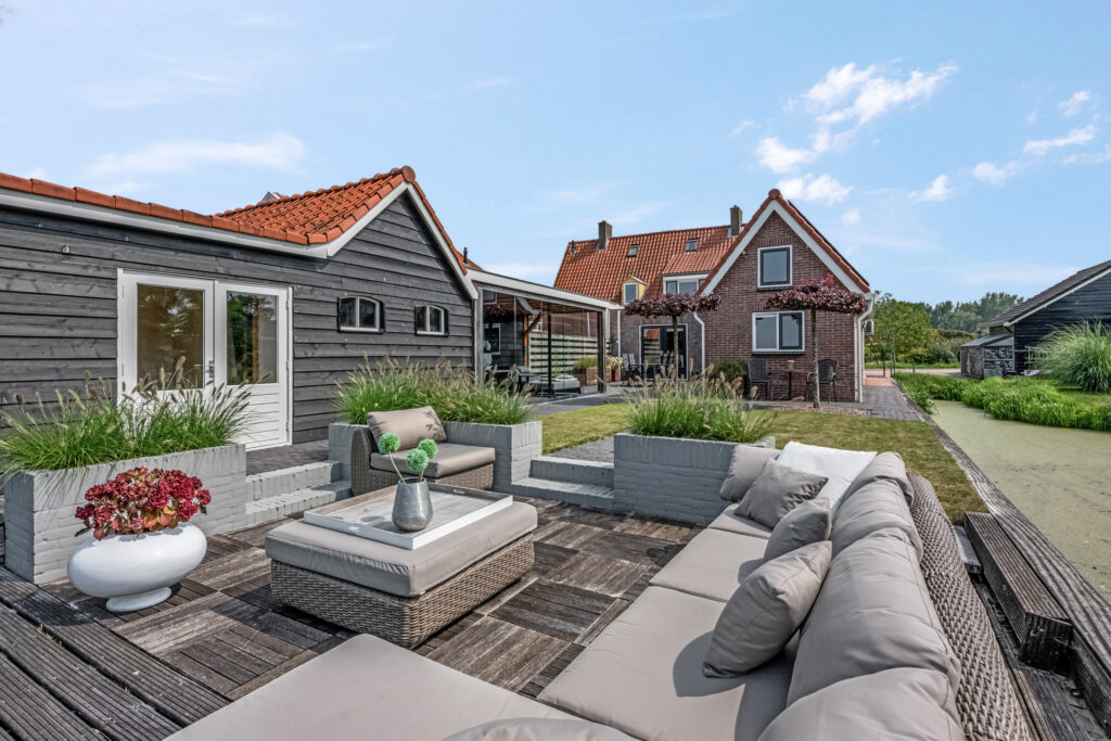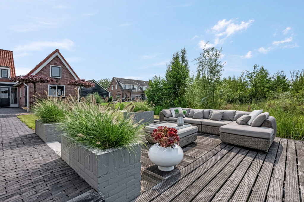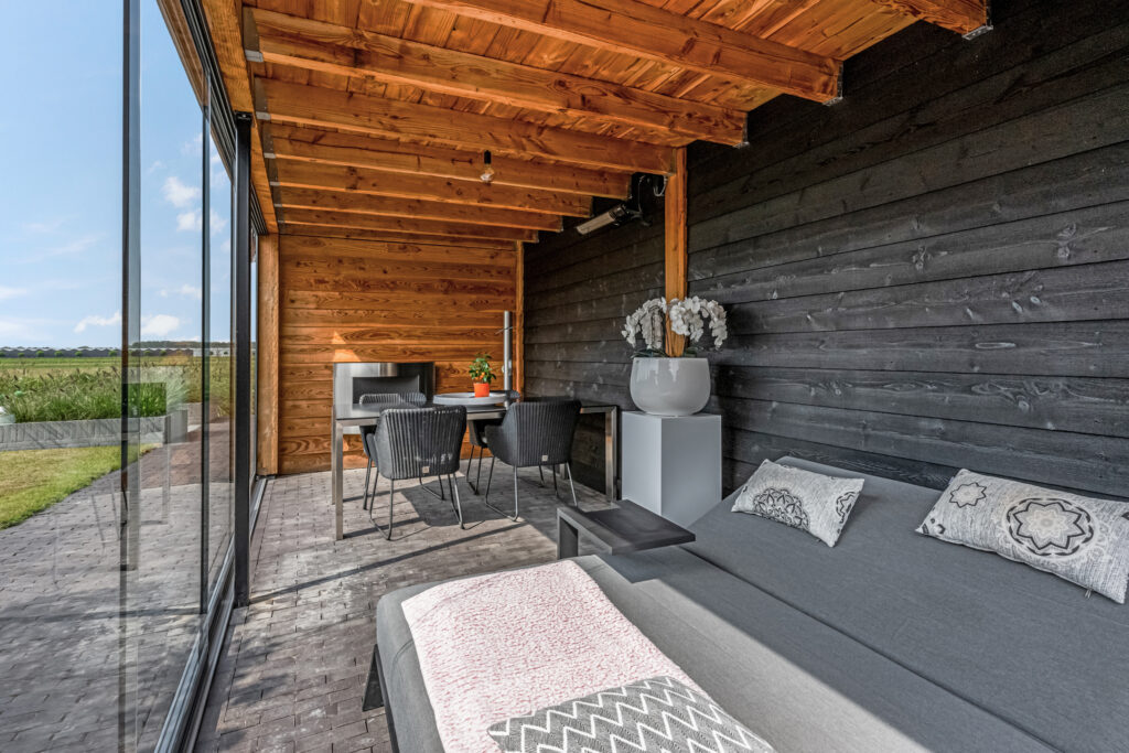 Buiten gaat het landelijke wonen pas echt leven: een ruime veranda met glaswanden en een terras waar je elk seizoen het uitzicht over de weilanden beleeft. Hier verveelt het beeld nooit – van grazende koeien in de zomer tot weidse vergezichten in de winter. Ook in de avonduren is het hier genieten van de ondergaande zon!