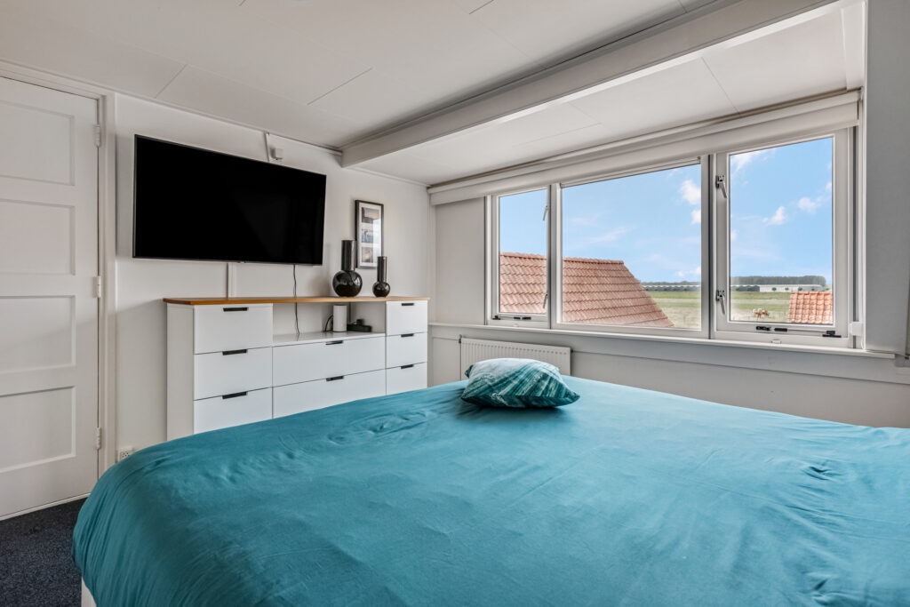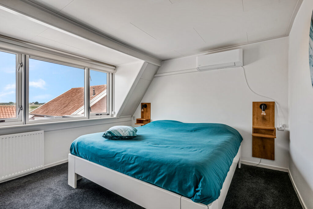 overloop met betegeld toilet. De overloop biedt toegang tot een drietal slaapkamers. De grootste slaapkamer is voorzien van airco. Aan zowel achter- als zijkant van van de woning zitten elektrische rolluiken. Daarnaast zijn de raampartijen zijn voorzien van horren.
