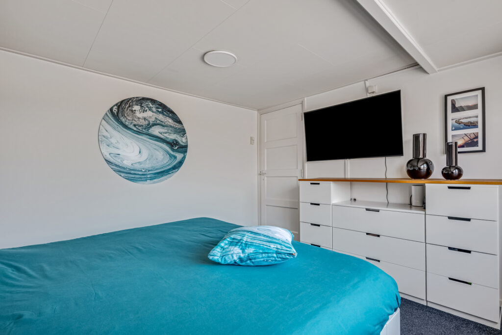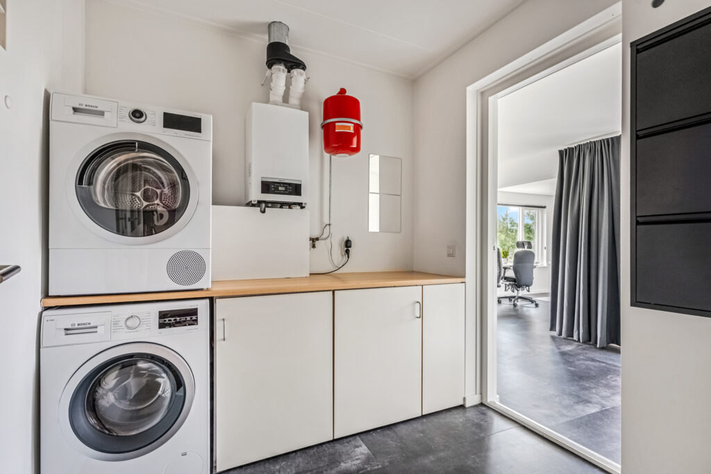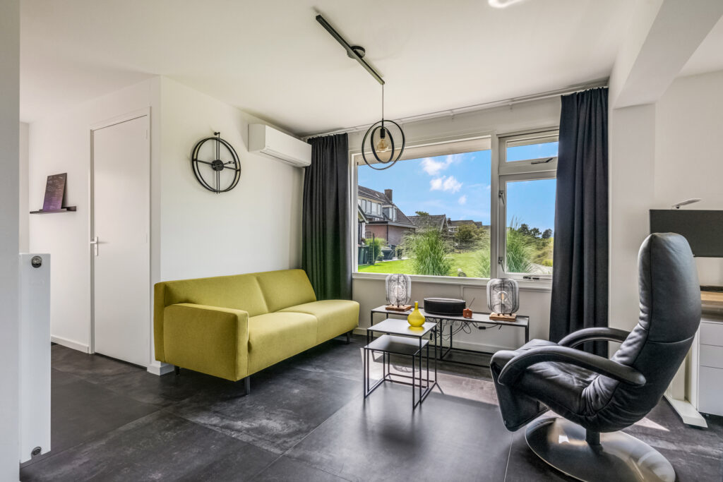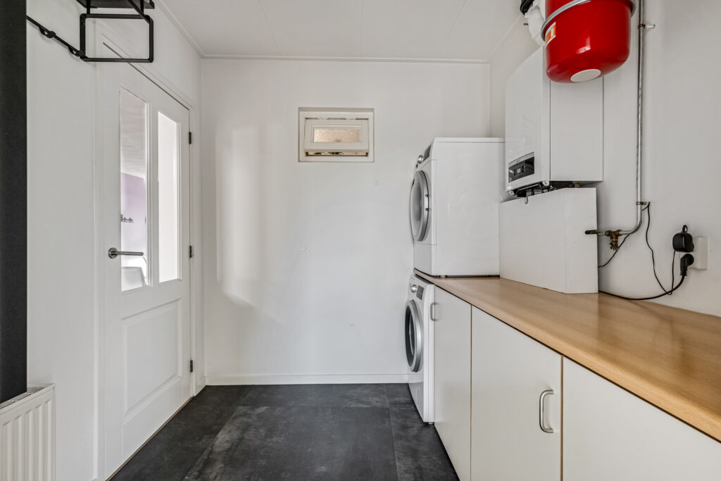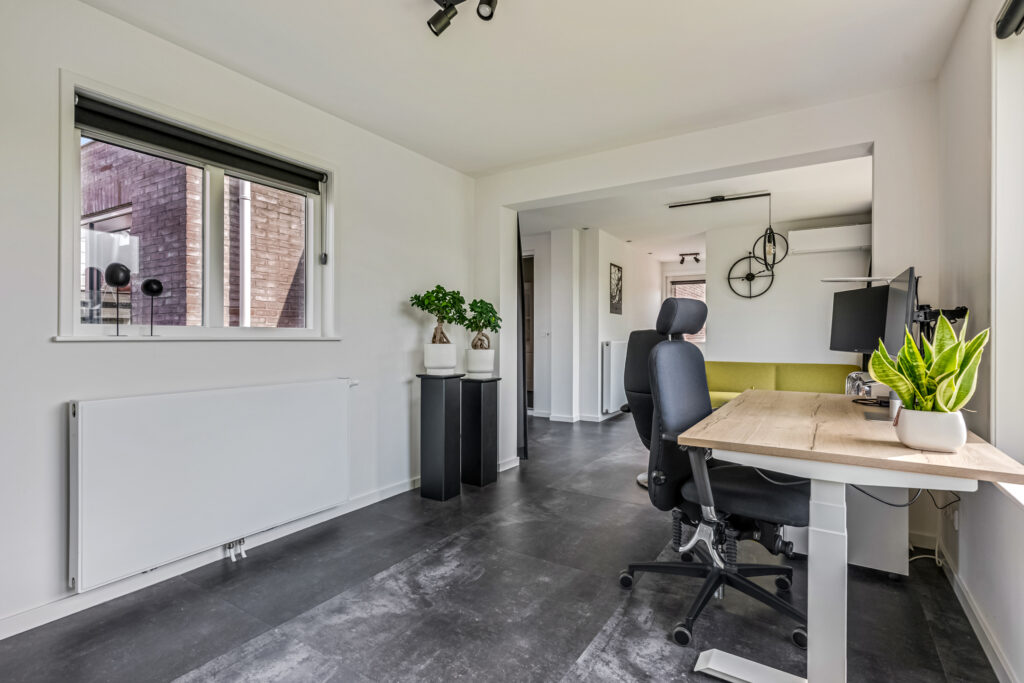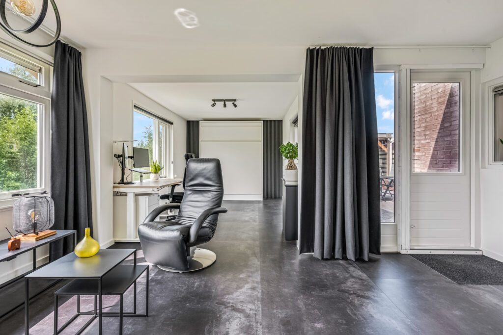 Via de bijkeuken met opstelling witgoed en CV (eigendom / 2016) is een multifunctionele ruimte bereikbaar. Deze ruimte is op een hele fraaie wijze aangekleed. De ruimte wordt thans gebruikt als kantoor, maar biedt tevens een moderne badkamer en een inklapbaar bed, zodat hier ook uitstekend op de begane grond kan worden geslapen. De aanwezige airco kan zowel de ruimte verwarmen als koelen.
