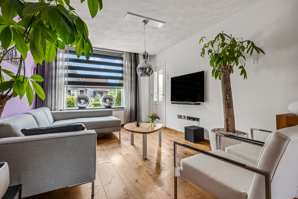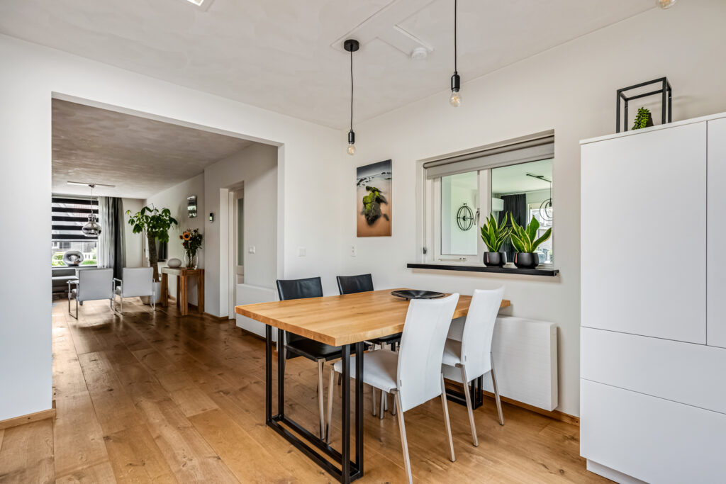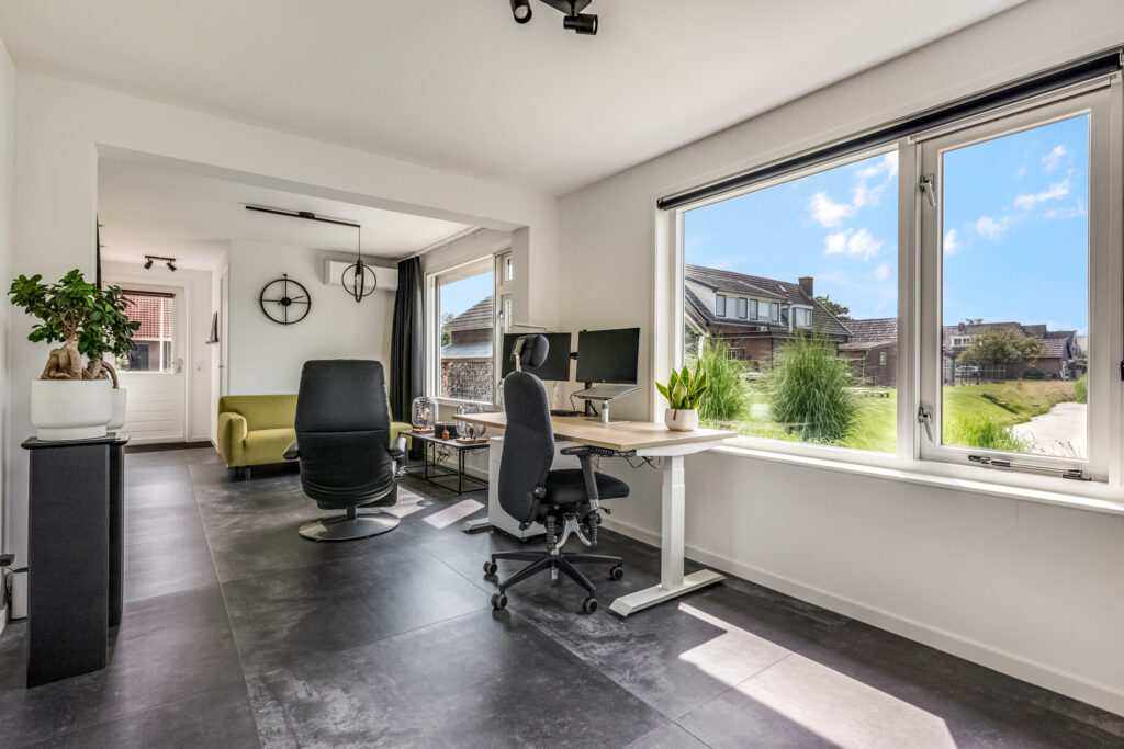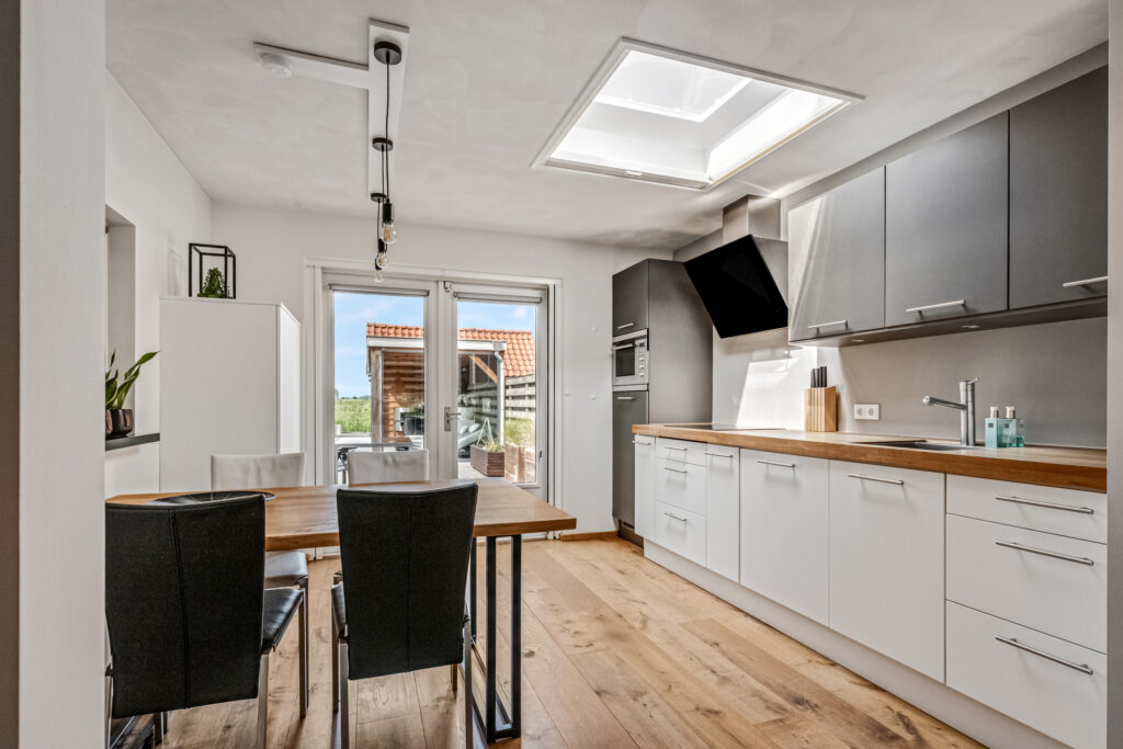 Vanuit zowel woonkamer als keuken zijn de vergezichten in de achtertuin goed te zien.