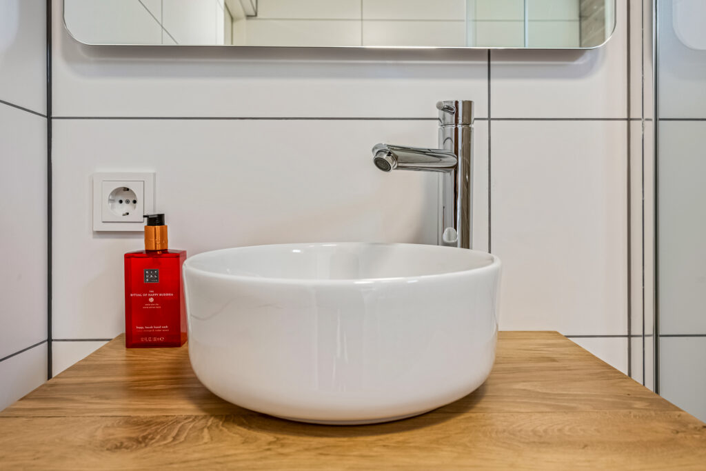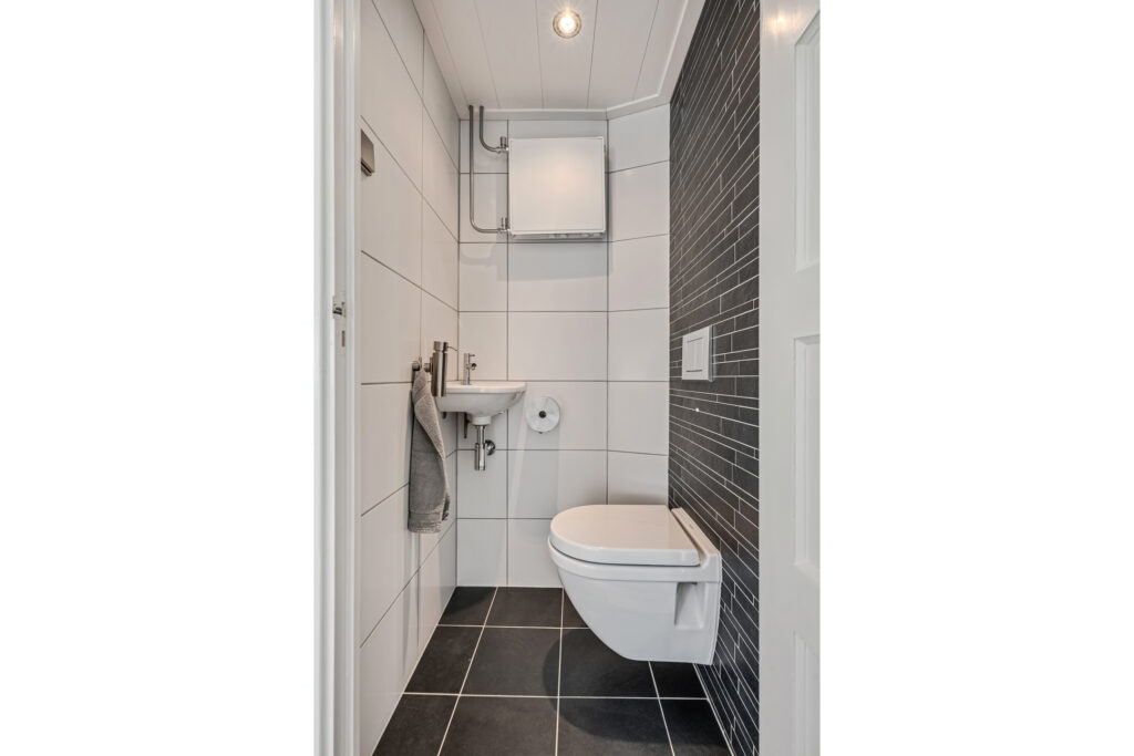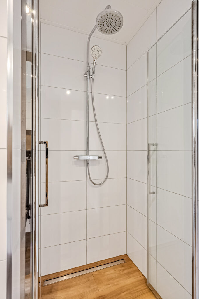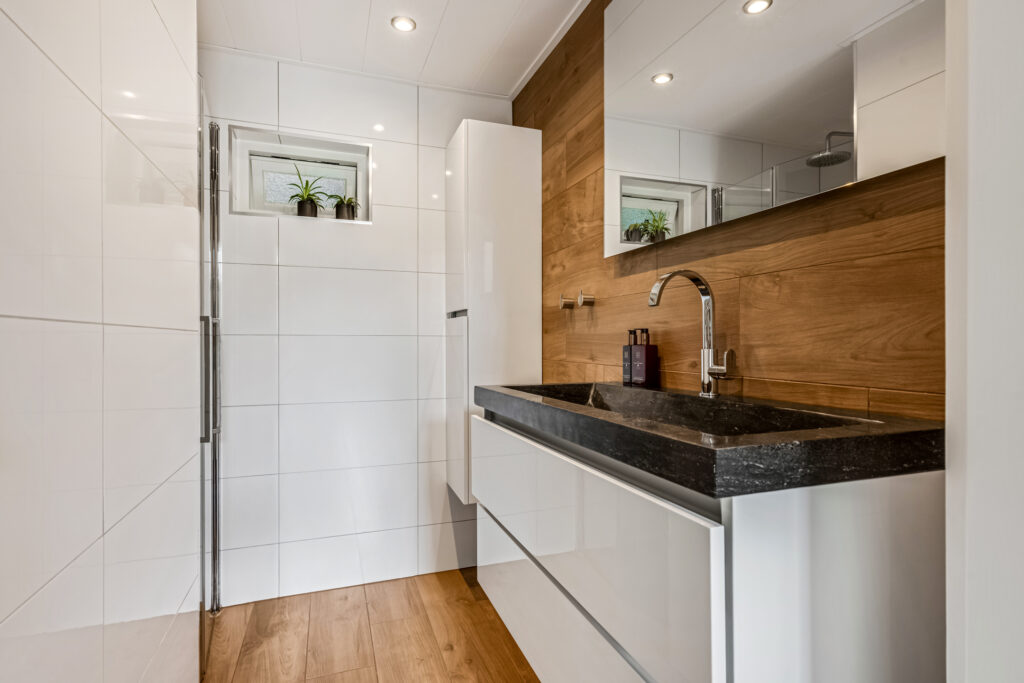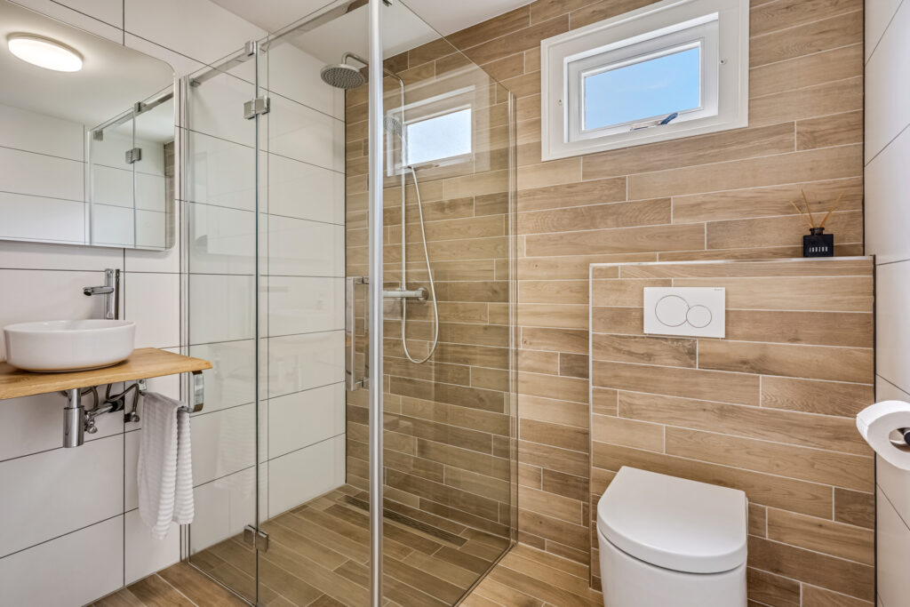 De badkamer is voorzien van een inloopdouche, toilet en een waskom. Ook in deze badkamer is elektrische vloerverwarming aanwezig.