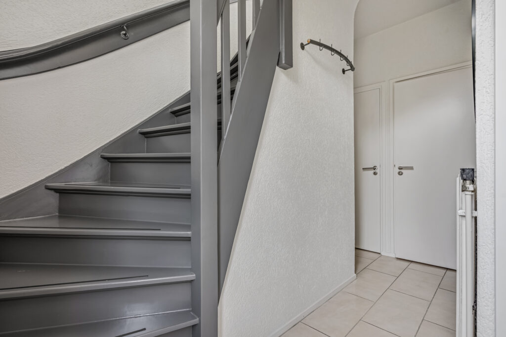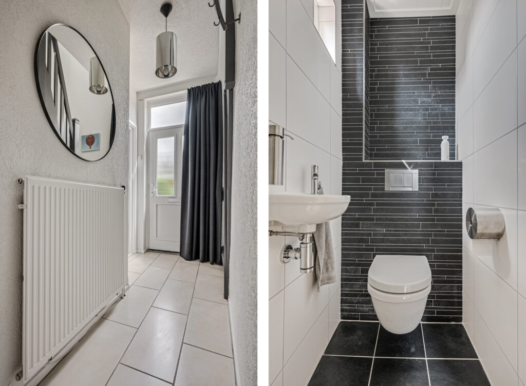 entree, hal voorzien van tegelvloer, toegang tot kelder, toilet en badkamer. De badkamer is keurig afgewerkt, heeft een inloopdouche en een vaste wastafel. Bovendien is hier elektrische vloerverwarming. In de kelder staat een waterontharder (ter overname).