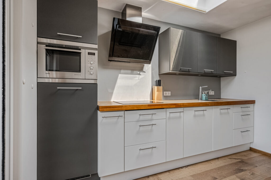 Aan de voorzijde van de woning bevindt zich de woonkamer. Deze woonkamer heeft een houten vloer en biedt voldoende ruimte voor het meubilair. Doordat de woning aan de achterzijde is uitgebouwd, is de verhouding keuken en woonkamer meer dan comfortabel. De keuken bevindt zich aan de achterzijde en voorzien van een inductie kookplaat, afzuigkap, vaatwasser, koelkast, combi- magnetron en voldoende bergruimte. De lichtkoepel zorgt voor meer lichtinval.
